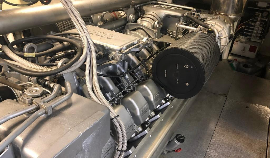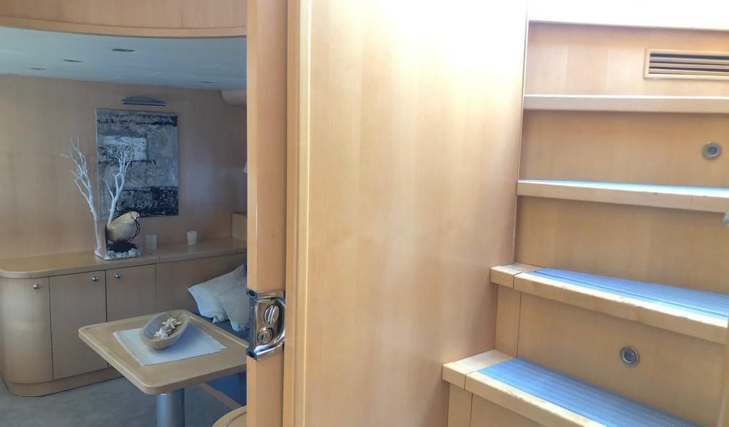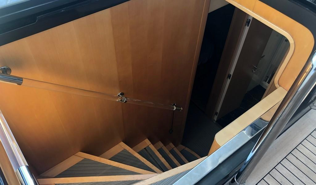 Con dos motores MTU de 2000 HP, alcanza una velocidad máxima de 30 nudos. El equipo de navegación incluye radar, GPS y piloto automático. La cubierta principal cuenta con un diseño Sideck abierto, y el salón ofrece una disposición versátil con techo retráctil. El yate tiene cinco cabinas, con capacidad para hasta 11 personas, incluida una suite principal de manga completa con cama king, tocador, sofá y armario, además de una gran zona de solarium y área de descanso en la popa y un espacioso solárium en la proa. El área para la tripulación está diseñada para tres personas, y la cocina está bien equipada, con un refrigerador nuevo. También incluye un amplio garaje, tender, altavoces Void, potentes amplificadores y conexión para mesa de mezclas DJ.