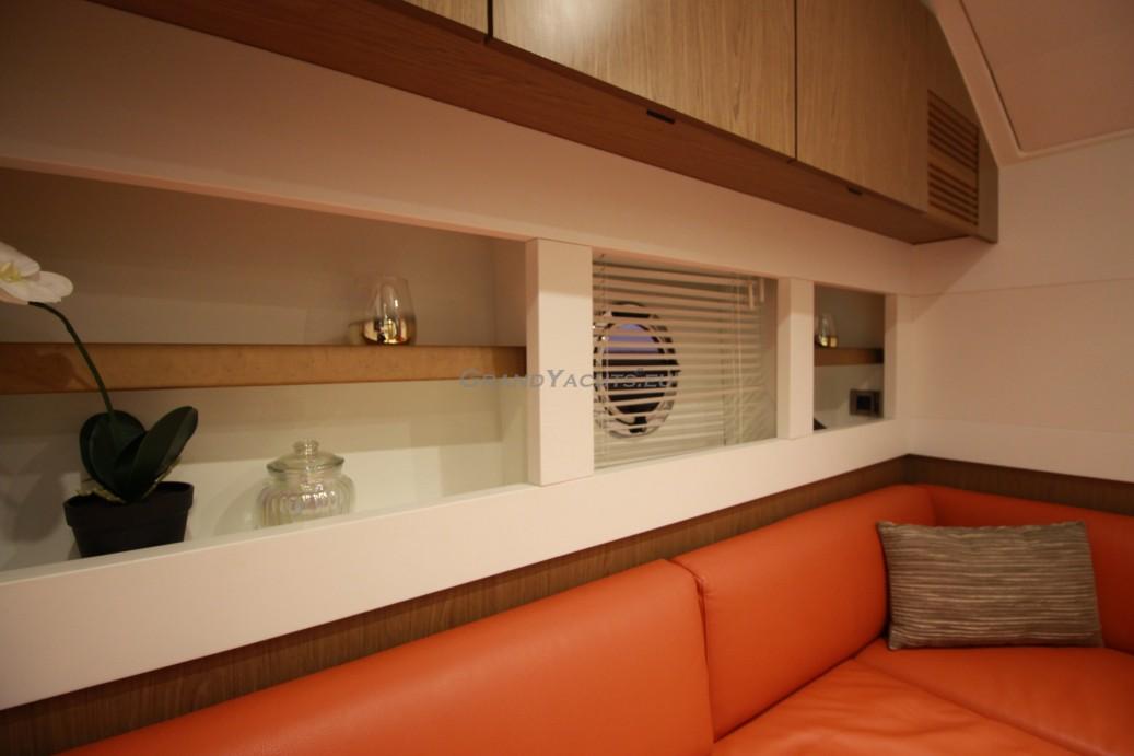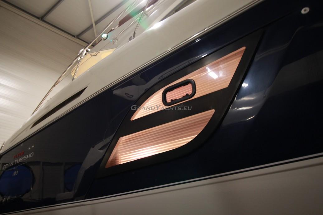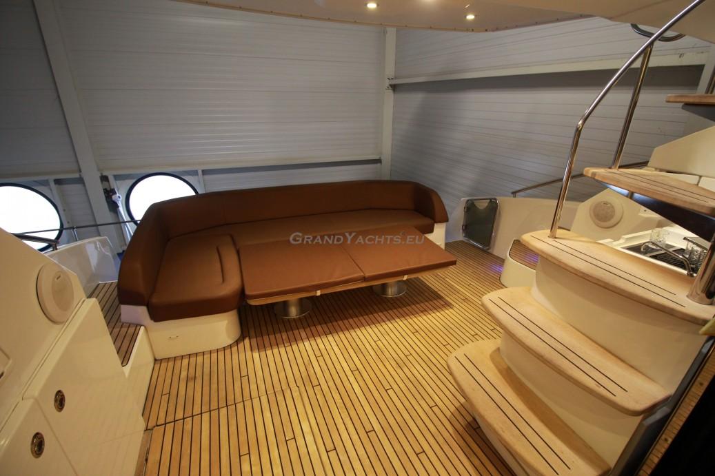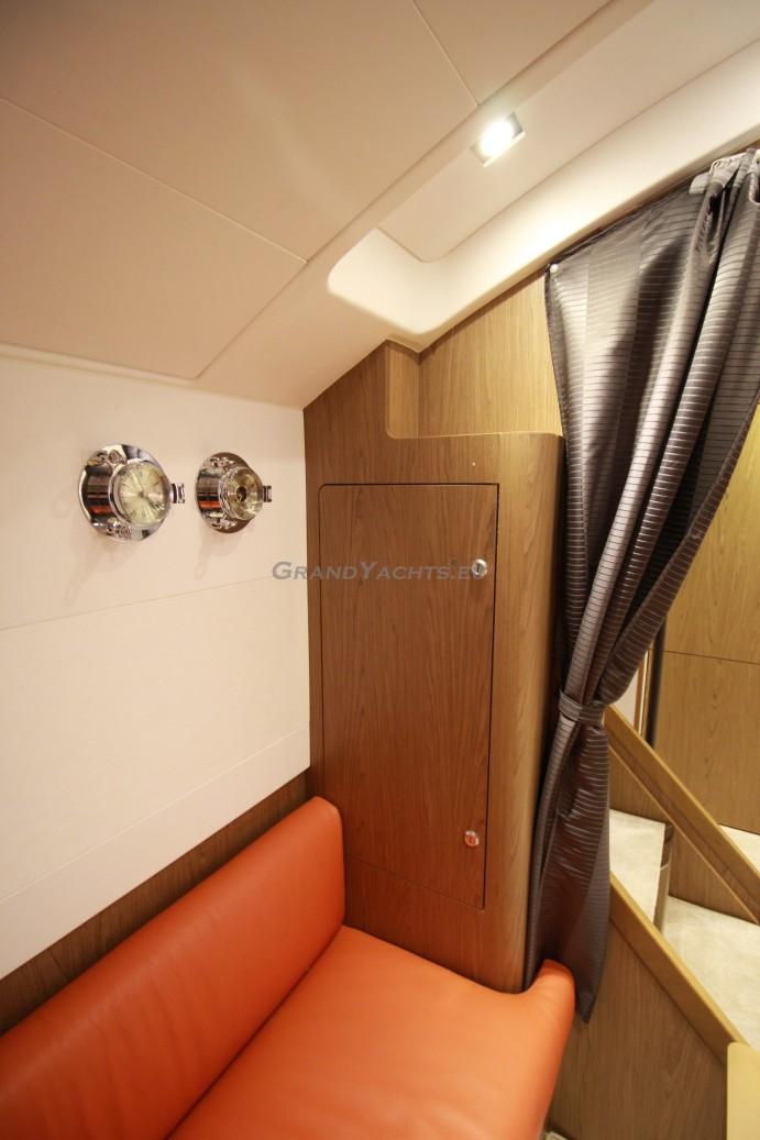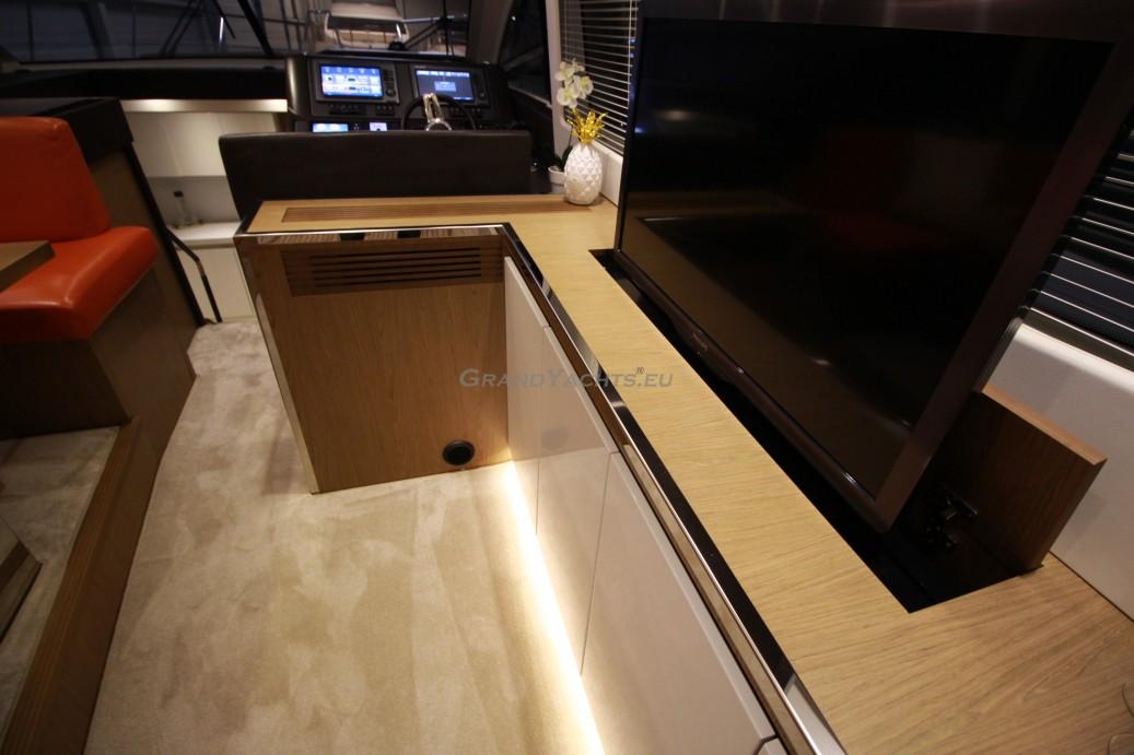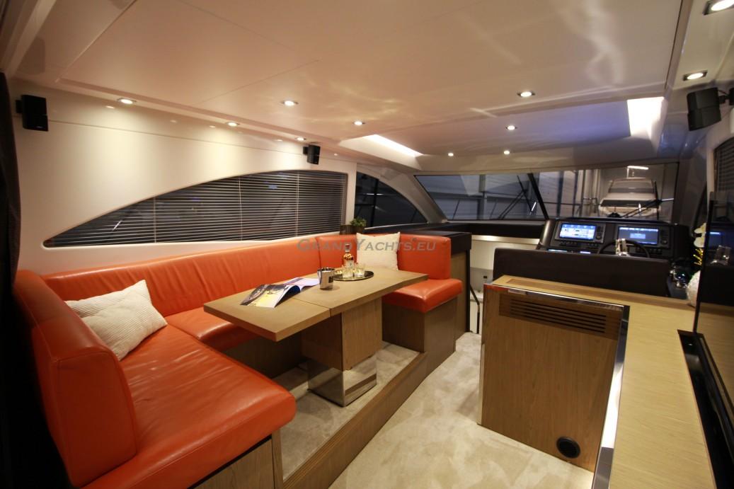 This Gran Turismo benefits of having a third control station with IPS joystick and bow thruster control integrated inside the grp mouldings on starboard just near the mirrored glass sliding door. The cockpit measures 2.69 m x 2.24 m and features teak decking and a solid wood table that is on an electrically actuated lift that raises it to dining position, and lowers to sun pad level. A settee seats 6 and there's room for two deck chairs for two to three more. An entertainment centre with sink, grill and fridge is forward and to port. In the deck is a hatch leading to the engine compartment. Under the seats is storage that holds two life rafts.