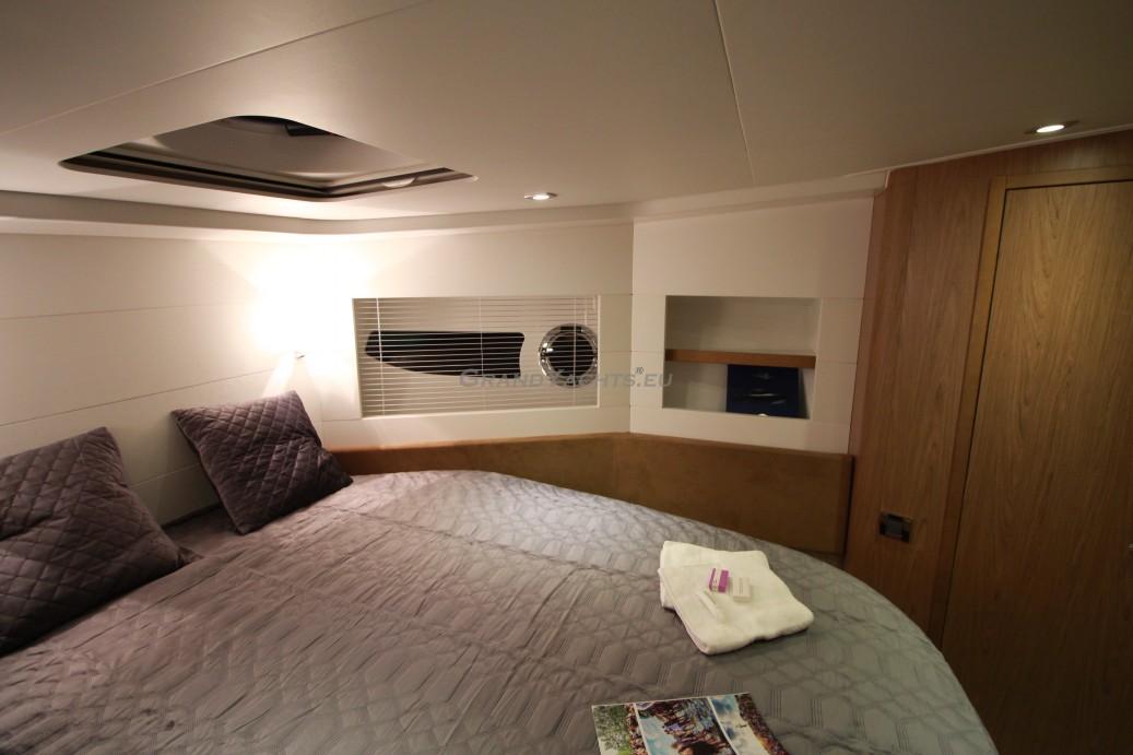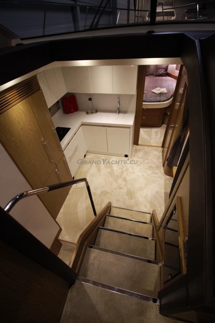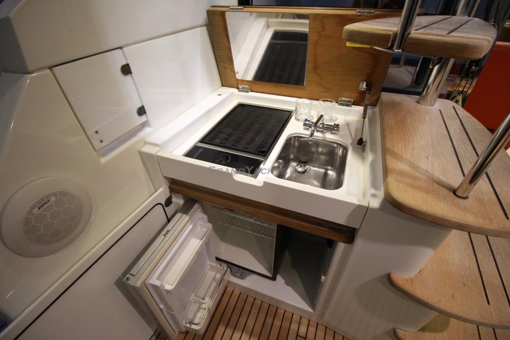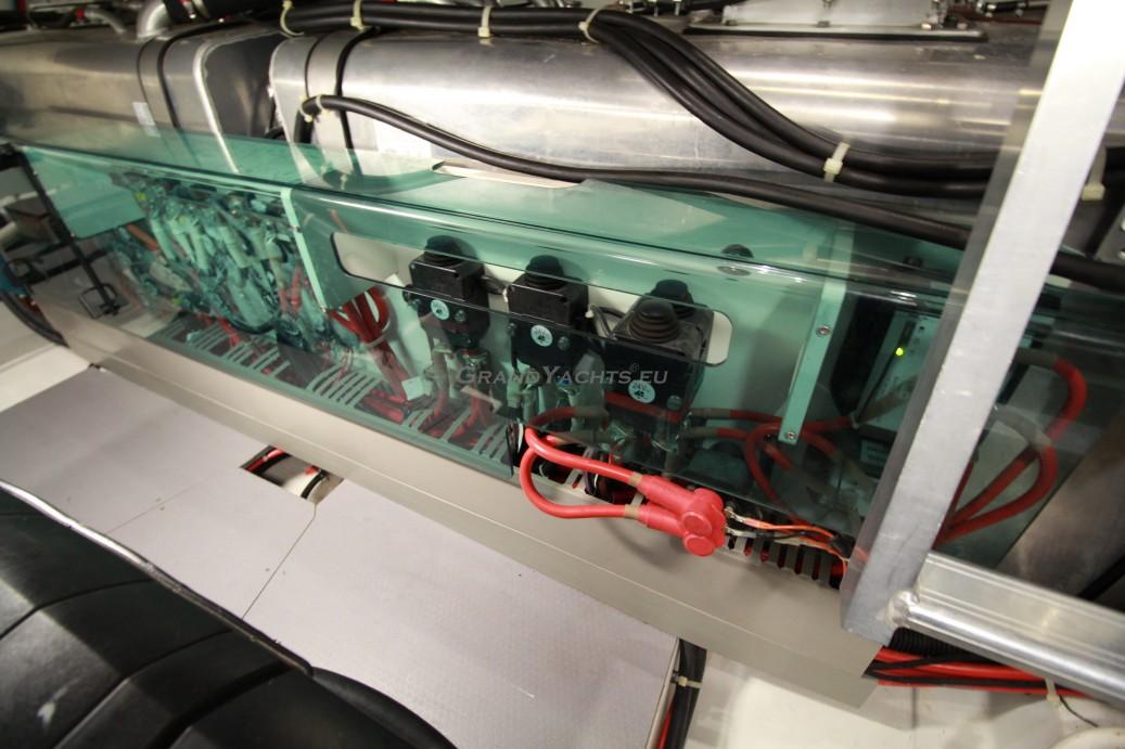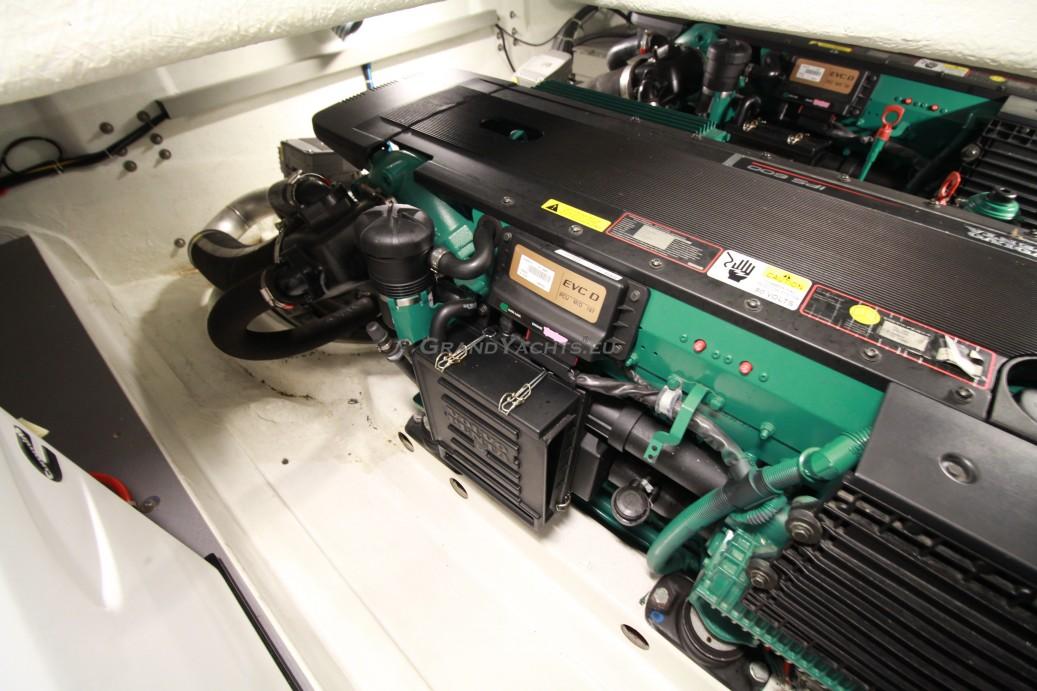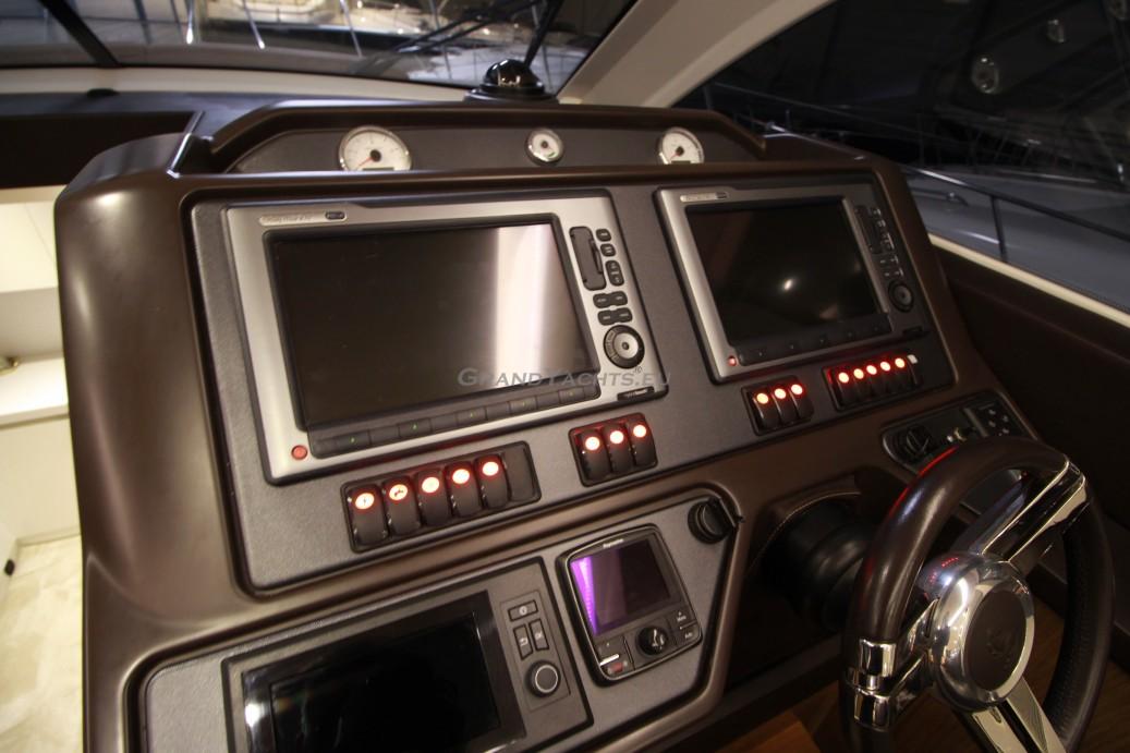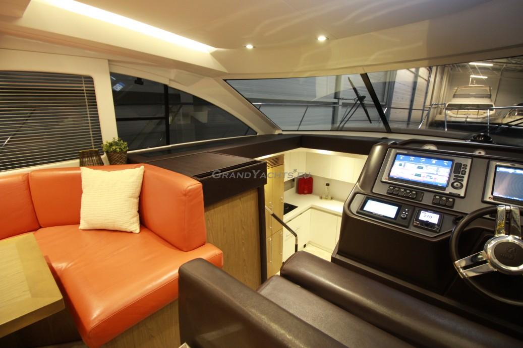This Gran Turismo benefits of having a third control station with IPS joystick and bow thruster control integrated inside the grp mouldings on starboard just near the mirrored glass sliding door. The cockpit measures 2.69 m x 2.24 m and features teak decking and a solid wood table that is on an electrically actuated lift that raises it to dining position, and lowers to sun pad level. A settee seats 6 and there's room for two deck chairs for two to three more. An entertainment centre with sink, grill and fridge is forward and to port. In the deck is a hatch leading to the engine compartment. Under the seats is storage that holds two life rafts.