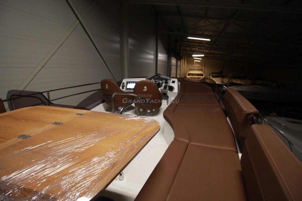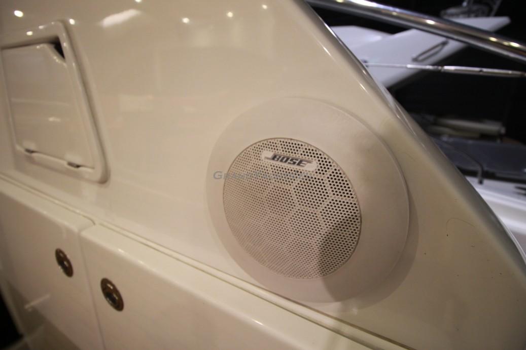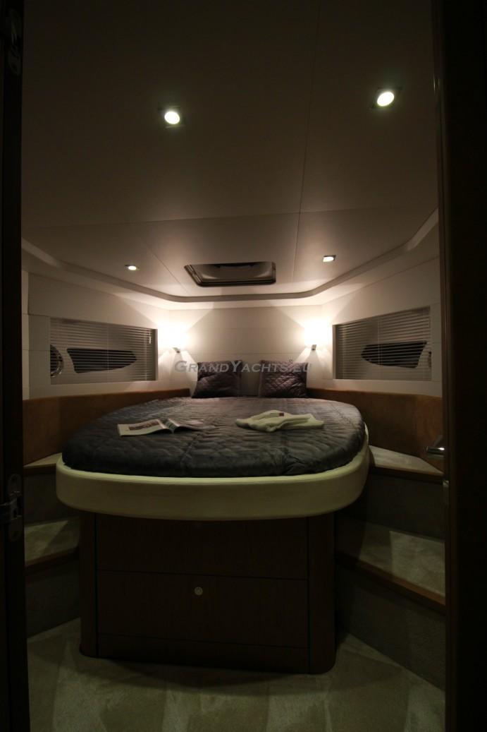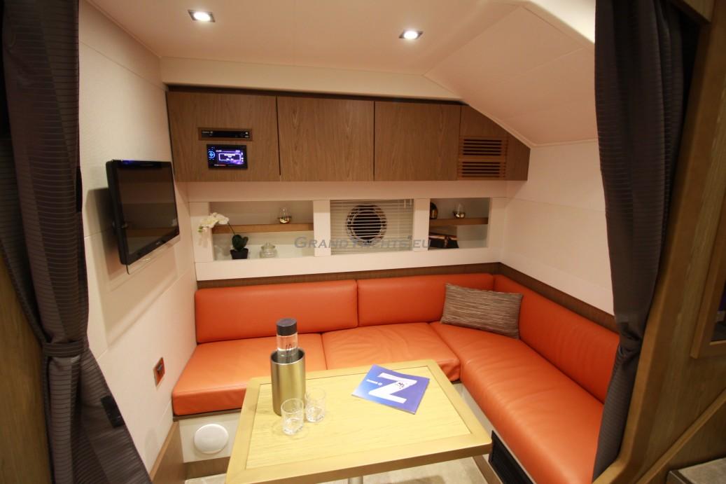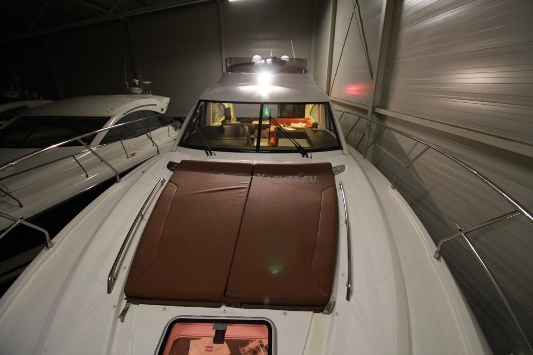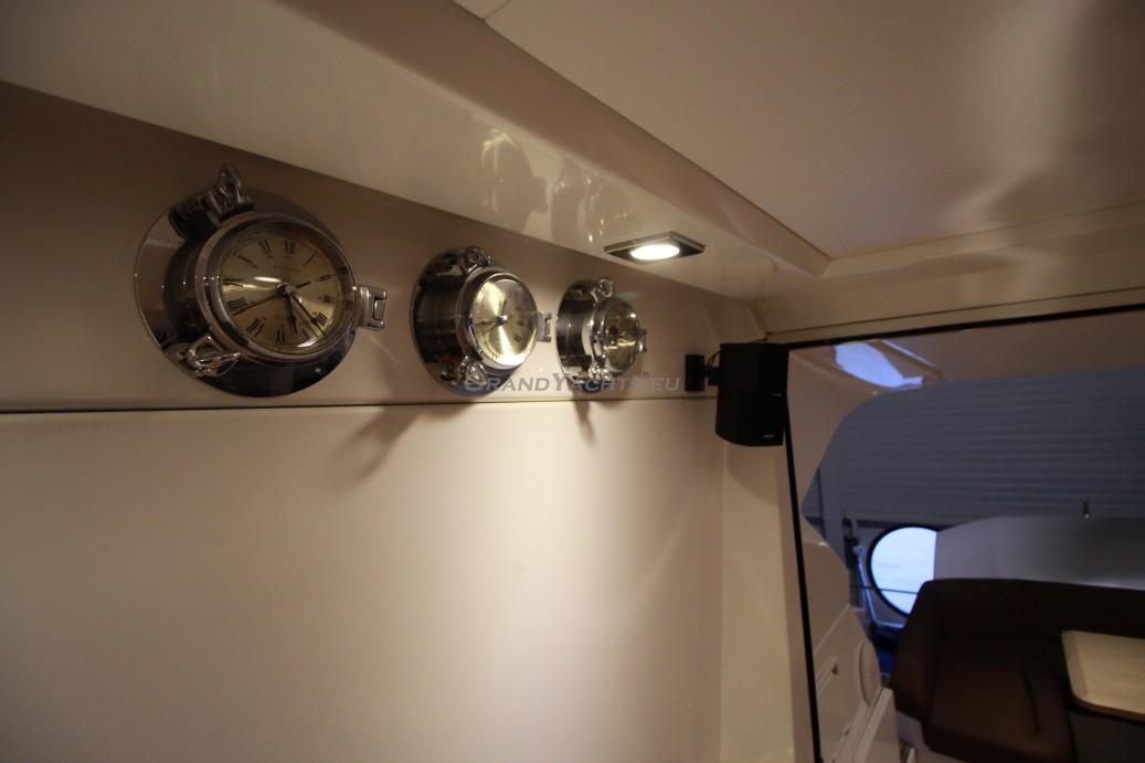 This Gran Turismo benefits of having a third control station with IPS joystick and bow thruster control integrated inside the grp mouldings on starboard just near the mirrored glass sliding door. The cockpit measures 2.69 m x 2.24 m and features teak decking and a solid wood table that is on an electrically actuated lift that raises it to dining position, and lowers to sun pad level. A settee seats 6 and there's room for two deck chairs for two to three more. An entertainment centre with sink, grill and fridge is forward and to port. In the deck is a hatch leading to the engine compartment. Under the seats is storage that holds two life rafts.