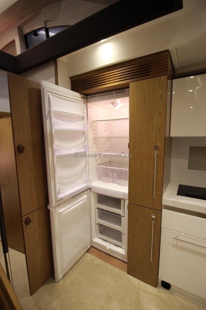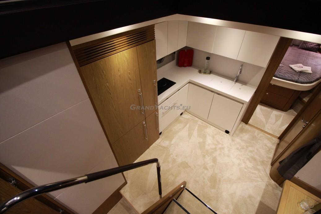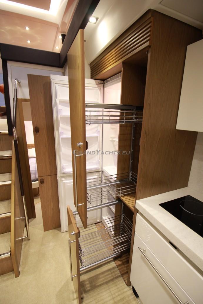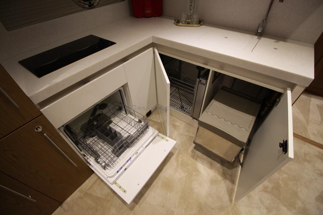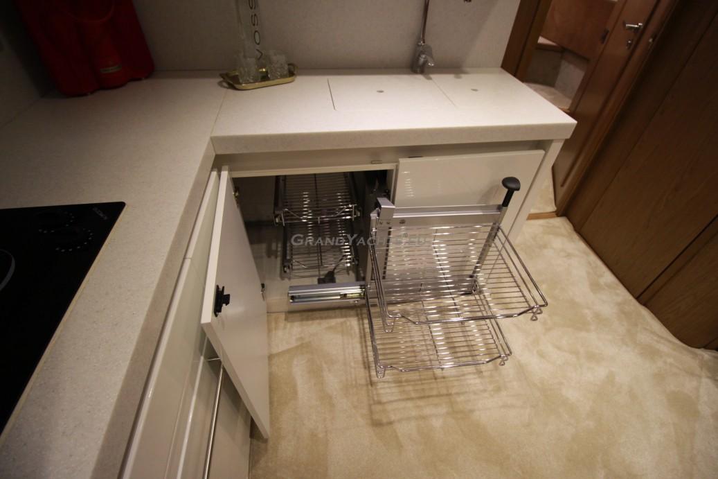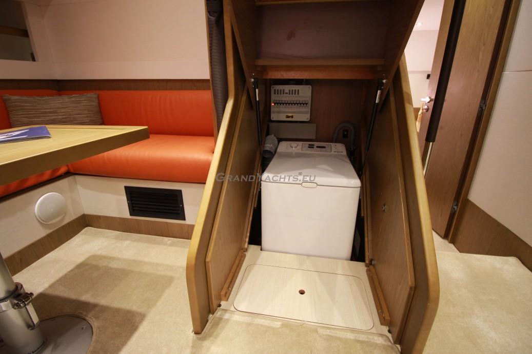 There is a full sized refrigerator/freezer behind wood panelled doors, and just next to the fridge is a narrow set of cabinets with pull out storage that recesses into the cabinet housing. This makes for a galley with as much storage as much larger yachts we’ve sold. Our Gran Turismo is even fitted with a dishwasher, just under the silverware drawer and not to forget a good sized washing machine and tumble dryer that is found under the staircase in the galley.