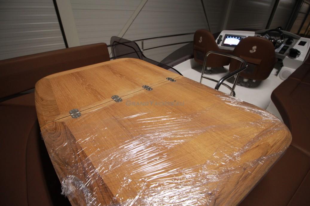 The optional flybridge is well laid out for entertaining with a roomy L-shaped settee aft. There's a solid wood table that will transform the aft settee into a sun pad. In the folded position the table reveals a grab handle that serves double duty of supporting the table in the extended position.