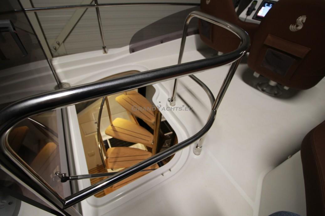 There is a hatch over the companionway that will allow you to lock out access to the flybridge when not onboard, and provide safety for younger occupants while underway. A safety rail surrounds the companionway as well.