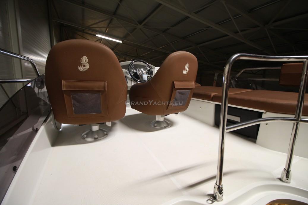 The helm is forward and centre-mounted with double bucket seats that swivel and slide. To the left is a Raymarine navigation display, and while it faces the captain, its location in front of the observer allows another person to take part in the navigation.