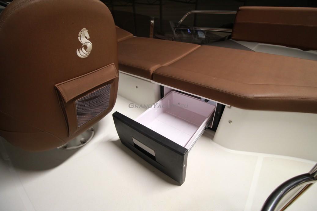 The entire starboard side of the flybridge is all seating that extends from the aft settee fully forward. The forward section culminates in a chaise lounge and a refrigerated drawer is located underneath the seat right next to the helm.
