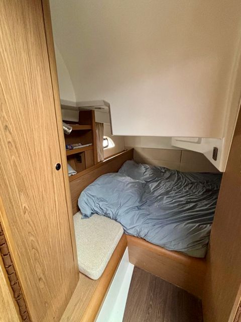 Owner’s cabin (160×220 bed), convertible saloon, optional 3rd berth in cockpit, bathroom (electric toilet), equipped galley (2-burner gas stove, 2 × 60 L fridges), interior & exterior sinks, hot-water deck shower, electric sunroof, large cockpit for 8 guests, full camper cover, full teak.