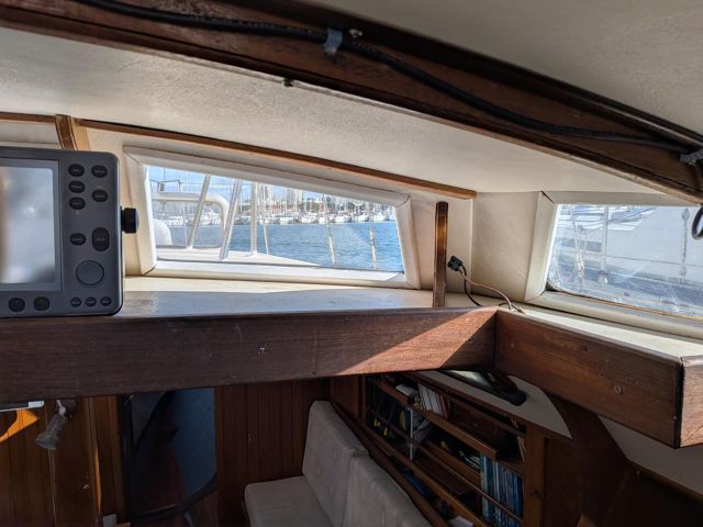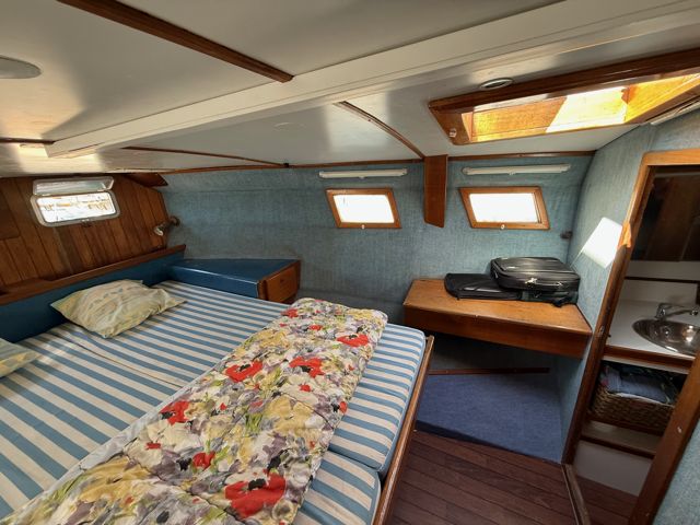 El interior es luminoso y amplio, con una timonería interior que ofrece visibilidad panorámica y una rueda interior conectada mecánicamente con la rueda exterior. El salón cuenta con una gran mesa modular rodeada de múltiples espacios de almacenamiento. La cocina está equipada con cocina ENO, calentador de agua a gas, frigorífico y tres depósitos de agua con un total de 320 litros. La cabina de popa ofrece una amplia cama doble y muchos armarios, mientras que la cabina de estribor dispone de dos literas convertibles. En proa, un baño con bañera y ducha de agua caliente da acceso a la cabina delantera con una cama semi-doble y un enorme cofre para velas y equipos.