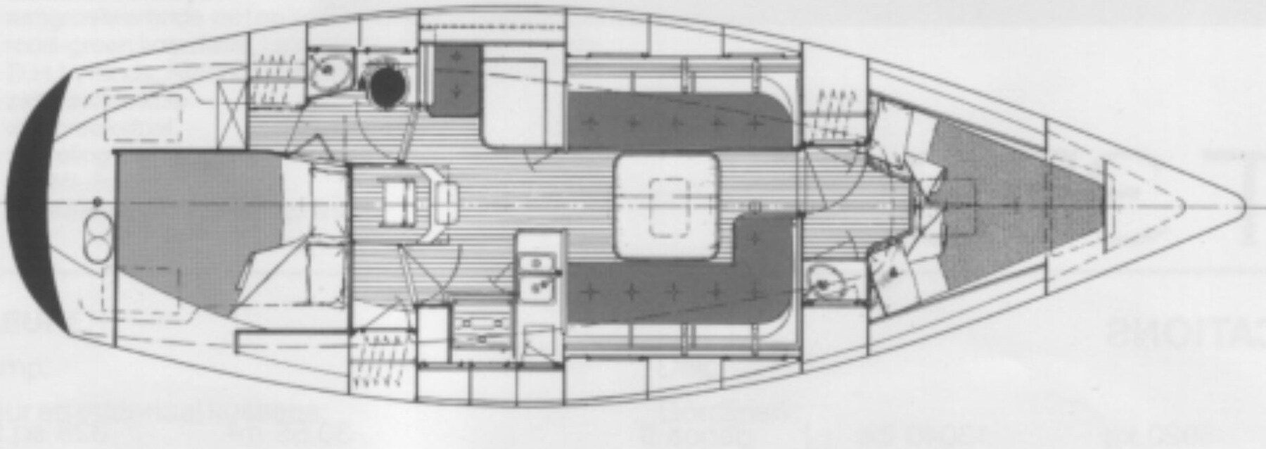 Ancre (Delta), Enrouleur pour cable électrique, 3 Batteries (Vetus, insgesamt 330 Ah), Passavant en teck, Chargeur de batterie (Victron 25A), Pompe de cale manuelle, Cockpit en teck, Prise de quai, Connexion eau sous pression à quai, Guindeau électrique (Maxwell vert.Ankerwinde mit Spill, RC10-8), Echelle de bain, table de cockpit, 2 Filières avec sortie latèrale, Pont en teck, Winch électrique avant, Windex.