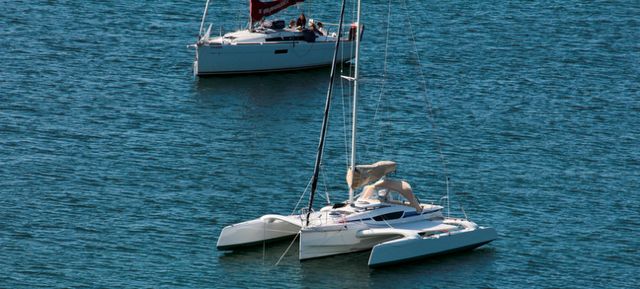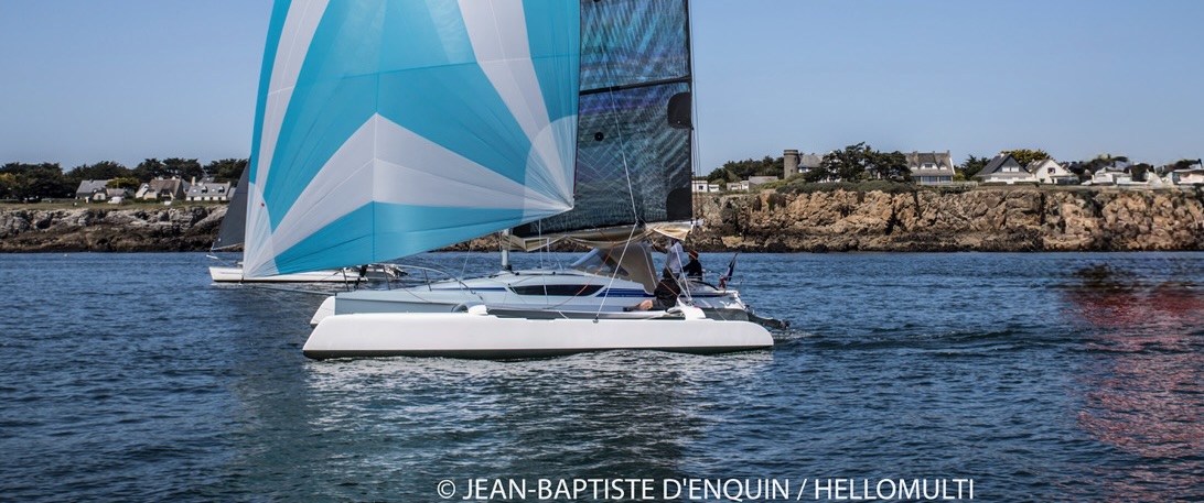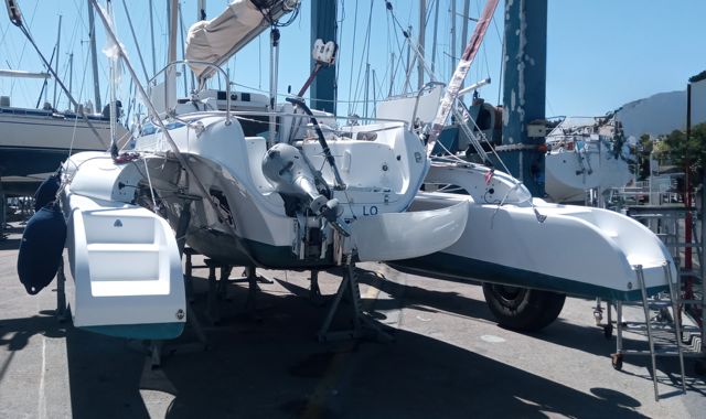 Longueur 8,75 m – Largeur déplié 6,50 m – Largeur replié route 2,54 m – Tirant d’eau dérive haute 0,40 m / dérive basse 1,70 m – Moteur hors-bord Honda 15 CV avec démarrage et trim électriques – Mât carbone 13,60 m peint blanc – Construction sandwich composite Divinycell