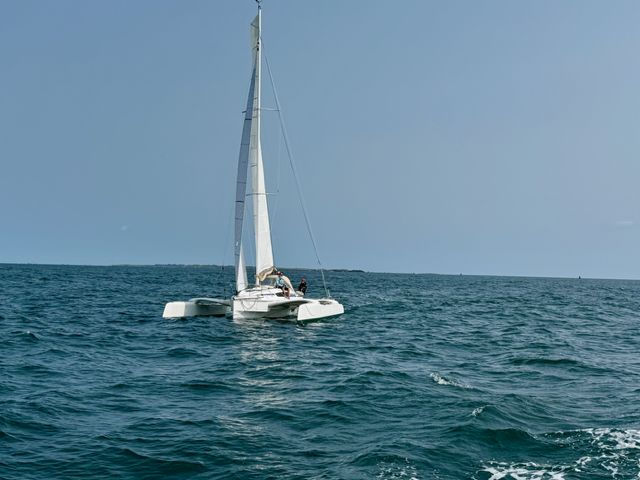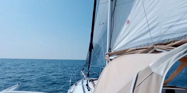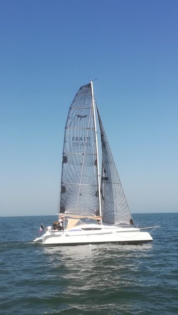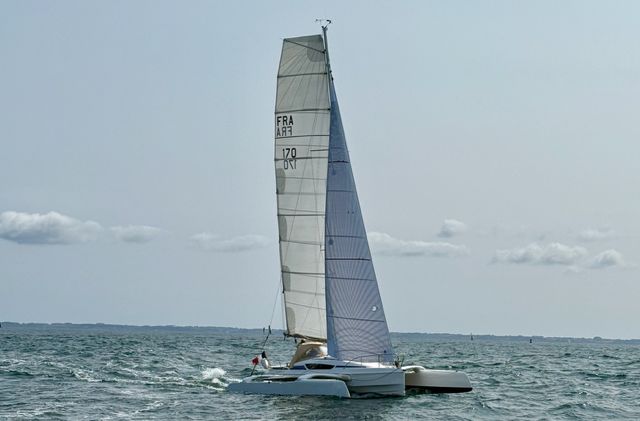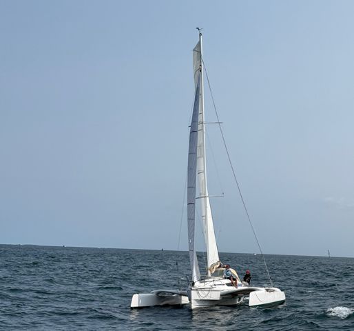 Mainsail 42 m² (2021) with tackled halyard (2024), lazy bag and lazy jacks – Genoa (2025) on Facnor furler 21.5 m² with cover – Asymmetric spinnaker with sock – Code 0 (2021) – Trampolines replaced in 2023 – Waterstays replaced in 2025 – Coppercoat applied May 2023 with touch-ups March 2025