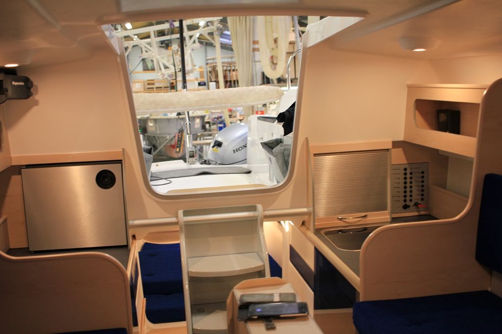 Cabine double avant avec rangements, cabine arrière d’appoint, couchette dans le carré – Cuisine équipée avec réchaud 2 feux, réfrigérateur 45 L, évier avec eau sous pression (90 L) – Cabinet de toilette avec WC marin, réservoir eaux noires 60 L, lavabo – Carré avec table pliante, rideaux Ocean Air Shade, moquette