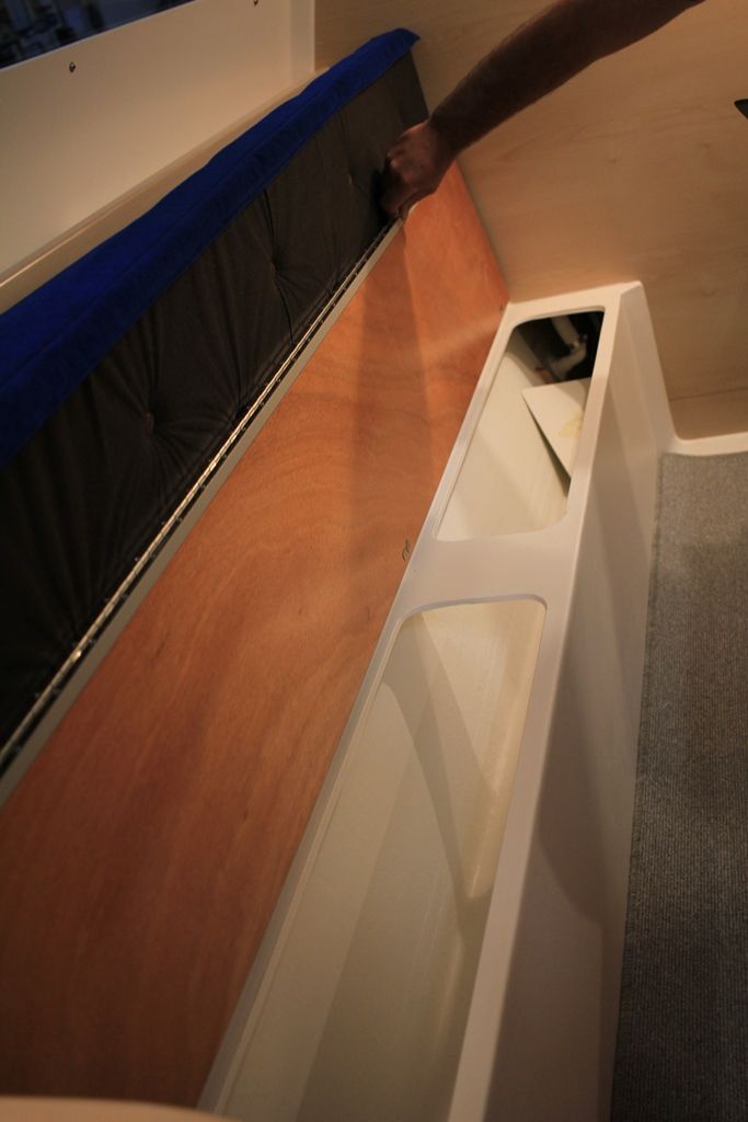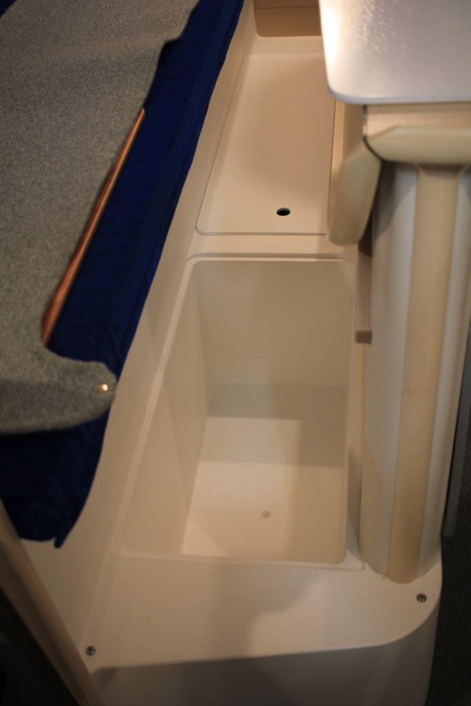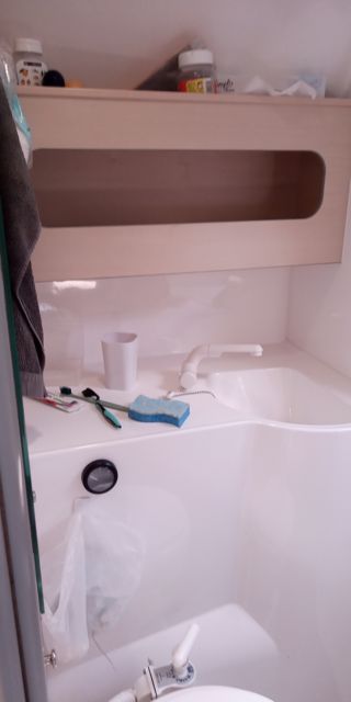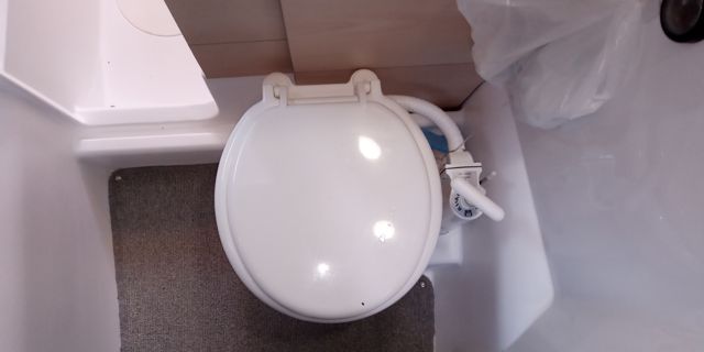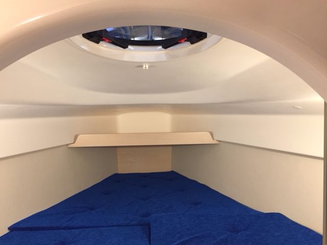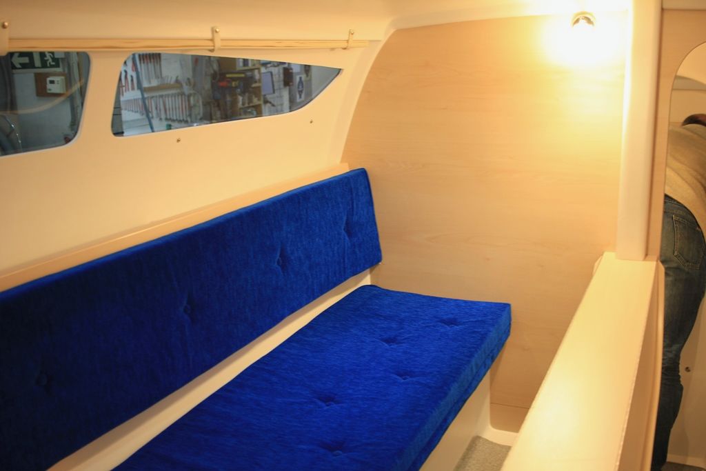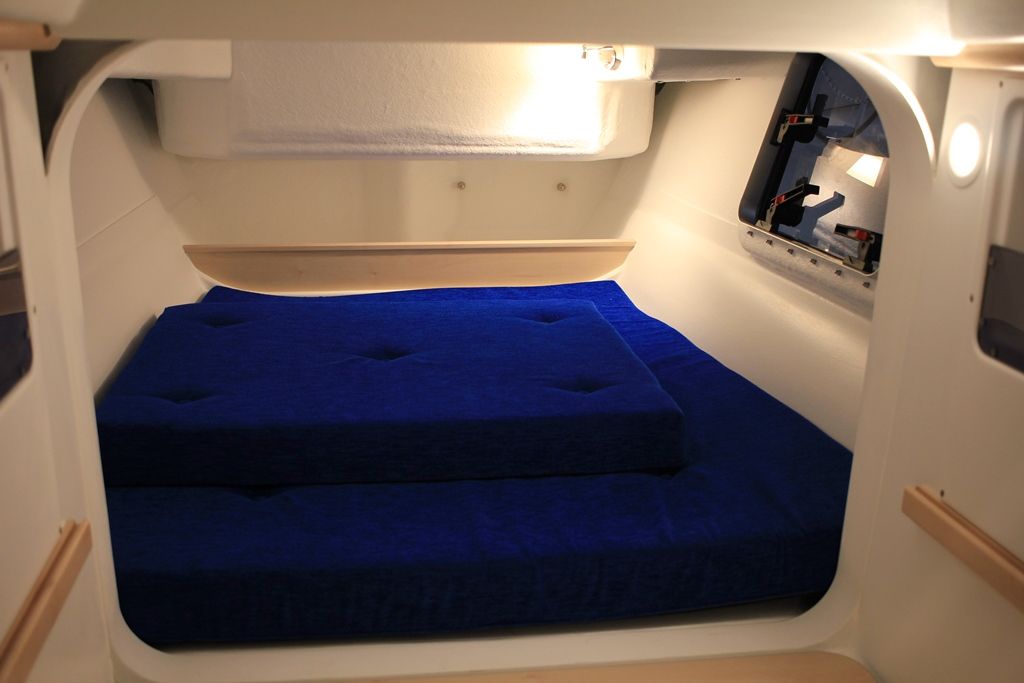 Forward double cabin with storage, aft cabin, single berth in saloon – Galley with 2-burner stove, 45 L fridge, sink with pressurized water (90 L) – Toilet compartment with marine WC, 60 L black water tank, sink – Saloon with folding table, Ocean Air Shade curtains, carpet