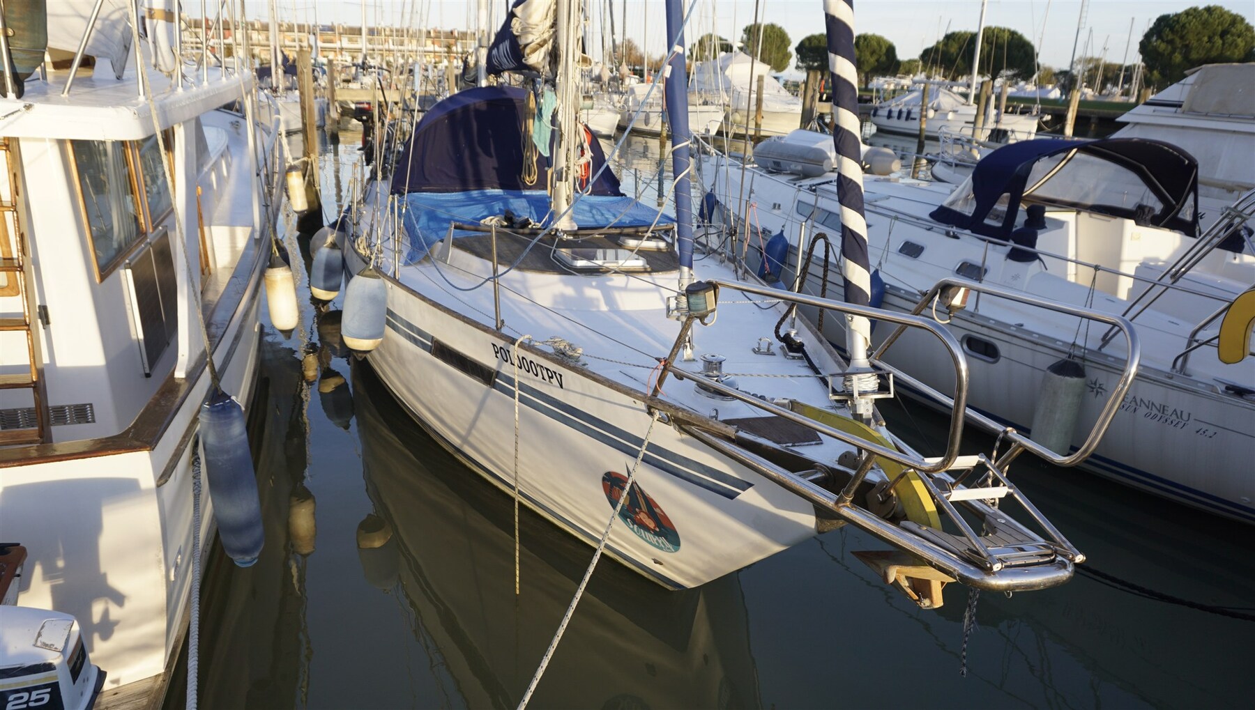 Alternator (new), Anchor (70 kg + 120 m 12mm chain), Water pressure pump, Batteries (2024/25), Deck Shower, Bow Thruster (rev. 2024), Wind Generator, Outboard Crane, Outboard engine for tender (TOHATSU 9.9), Solar panels, Fenders, Gangway, Platform, Manual Bilge Pump, Shorepower connector, Electric Windlass, swimming ladder (+ bow ladder), cockpit table, Tender (RIB), Winch, Winch Electric (2 x), Windex.