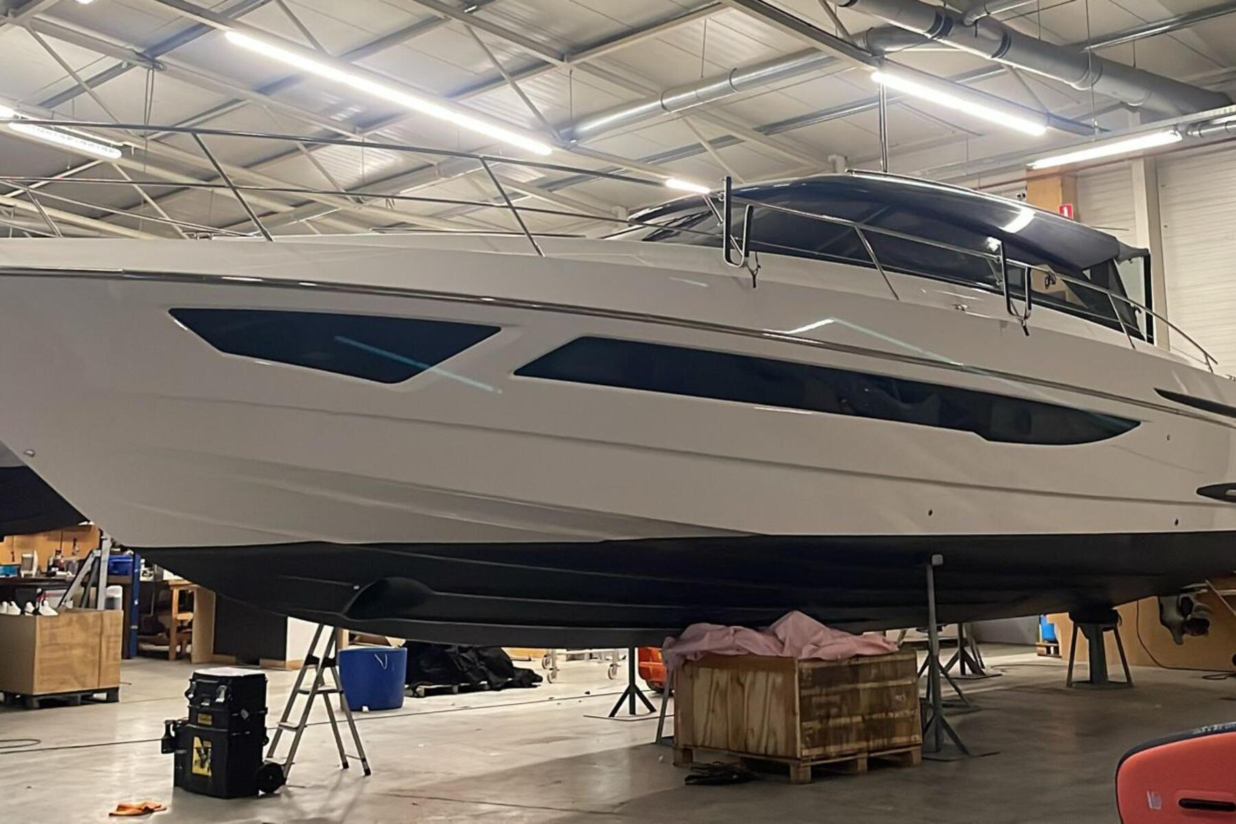 It is currently in dry storage inside the Focus Motor Yachts headquarters facility in Wanssum, The Netherlands.