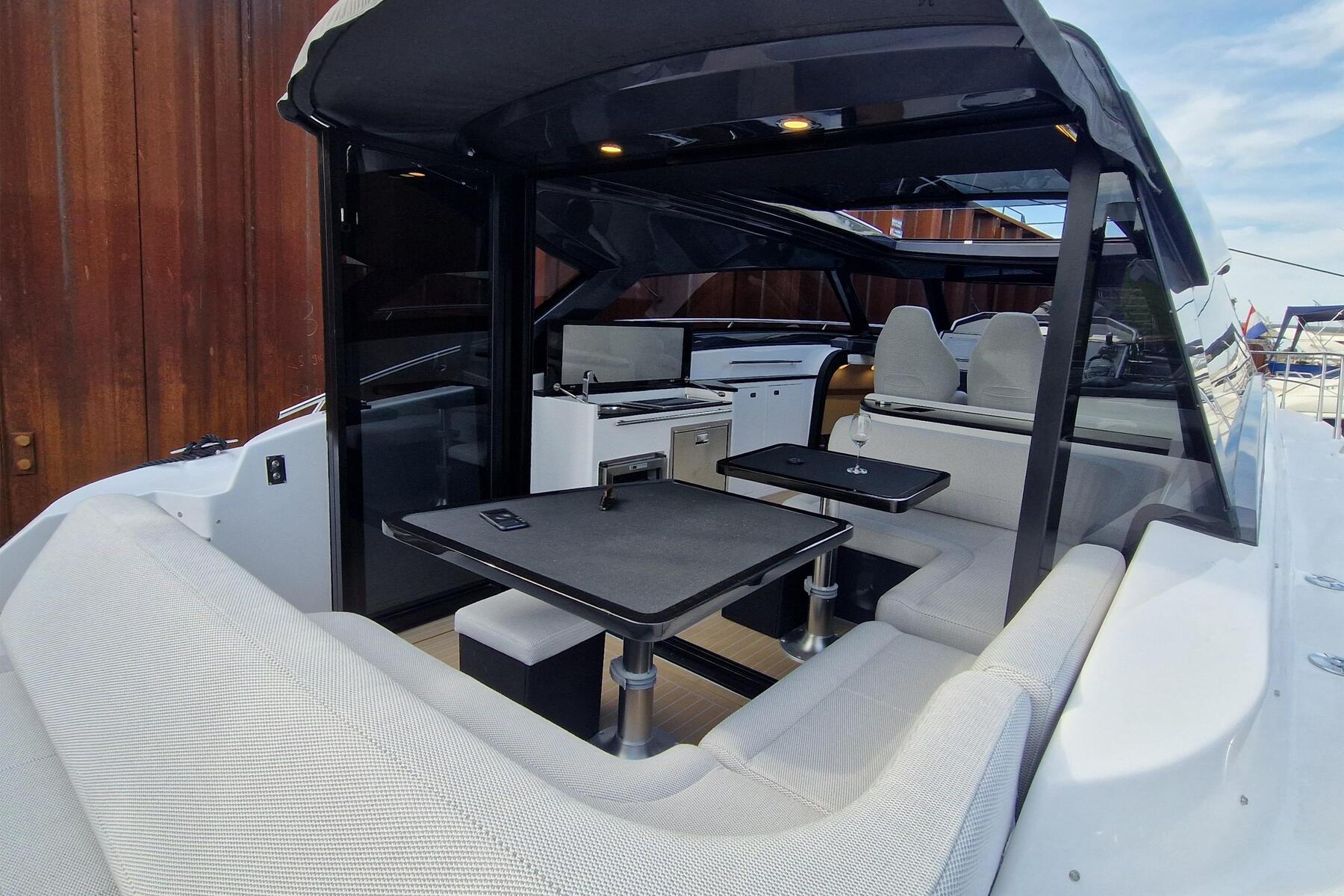 The fully-equipped, Focus Power 44 M/Y Dragonfly, with only 14 engine hours, is in like-new condition.