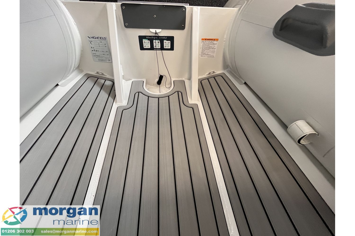 Deck: PVC tubes 44cm diameter. Self-draining deck. Welded seams, Flush mount non return valves, High tensile chromated & powder coated aluminium hull. Bow locker (Fit 24L fuel tank). Integrated transom supports. Bow cushion. Lifting points and towing eyes. Tow bridle points. Brushed foam teak finish deck. Heavy duty rubbing strake and full length keel guard.
