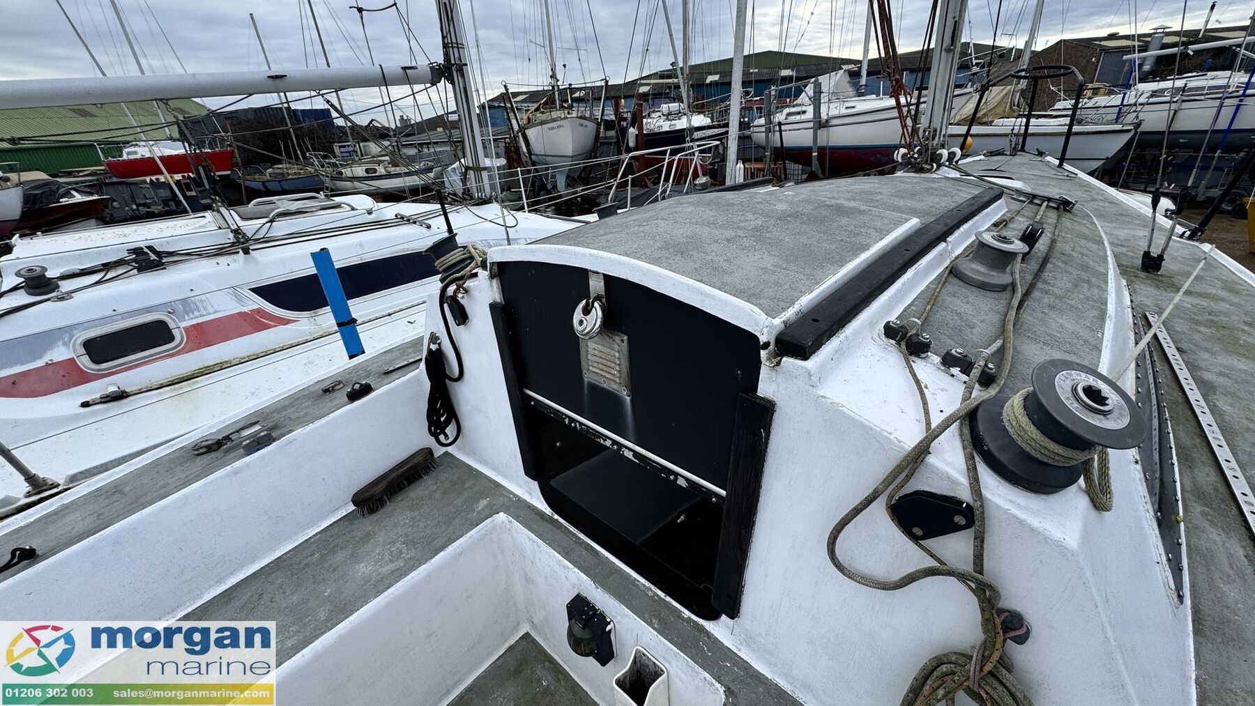 Deck: Fin keel. Copper coated hull (January 2026). Deck fast performance yacht. Bermuda rig. Genoa 120 percent sail. Main sail with reefing point. Spinnaker and pole. Standing rigging done 7 years ago. Anchor locker with anchor, chain and rope. Guard rails. Mooring cleats. Rudder steering. Visual wind direction up top of mast. Bridal main sheet system. Horseshoe life buoy. Boat hook. Fenders and lines.