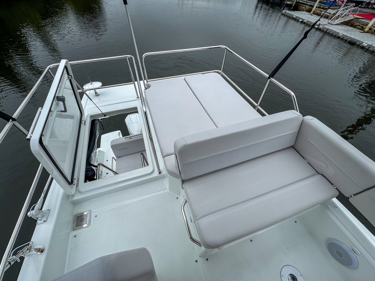 Other features include a self-bailing cockpit, a sliding aft bench seat, a large lockable cockpit locker, starboard swim access and a swim ladder, a cockpit security door, a cockpit shower, a removable cockpit table, a 12V electrical panel, two electric bilge pumps, a manual bilge pump, and a head with a marine toilet, a shower, a sink, and storage.