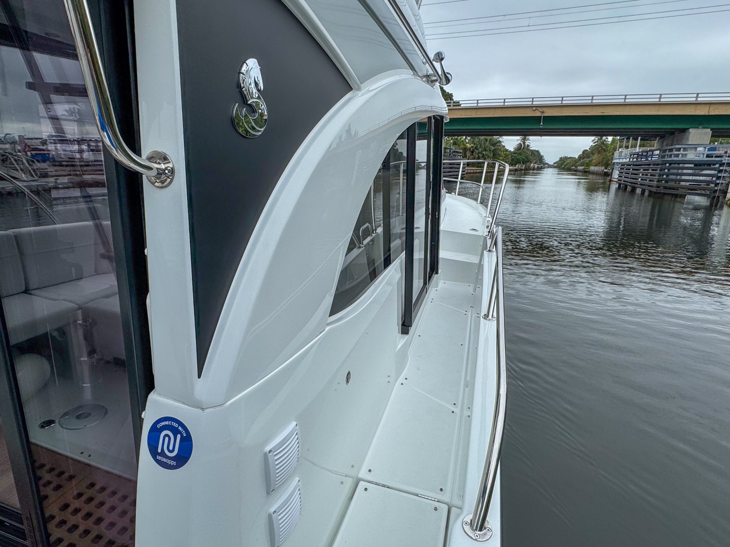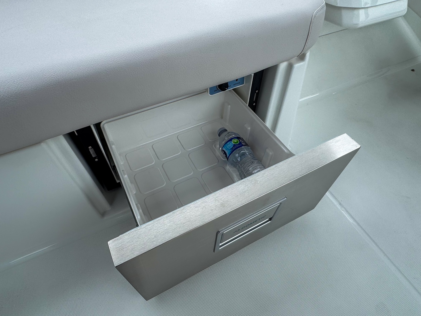 The steering station includes a steering compass, a dash with plenty of space to mount electronics, full instrumentation, a 12V power outlet, hydraulic steering, cup holders, a tinted windscreen, two electric windscreen wipers, and an adjustable pilot seat. Aft of the steering station is the galley. The galley includes as standard a fixed two-hob cooker, an 80L refrigerator, a garbage bin, a stainless steel sink, and a tinted glass lid to protect the worktop.