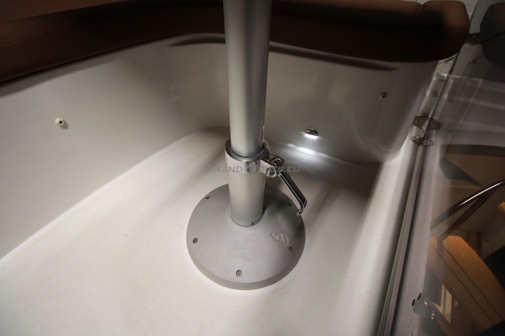 This Gran Turismo benefits of having a third control station with IPS joystick and bow thruster control integrated inside the grp mouldings on starboard just near the mirrored glass sliding door. The cockpit measures 2.69 m x 2.24 m and features teak decking and a solid wood table that is on an electrically actuated lift that raises it to dining position, and lowers to sun pad level. A settee seats 6 and there's room for two deck chairs for two to three more. An entertainment centre with sink, grill and fridge is forward and to port. In the deck is a hatch leading to the engine compartment. Under the seats is storage that holds two life rafts.