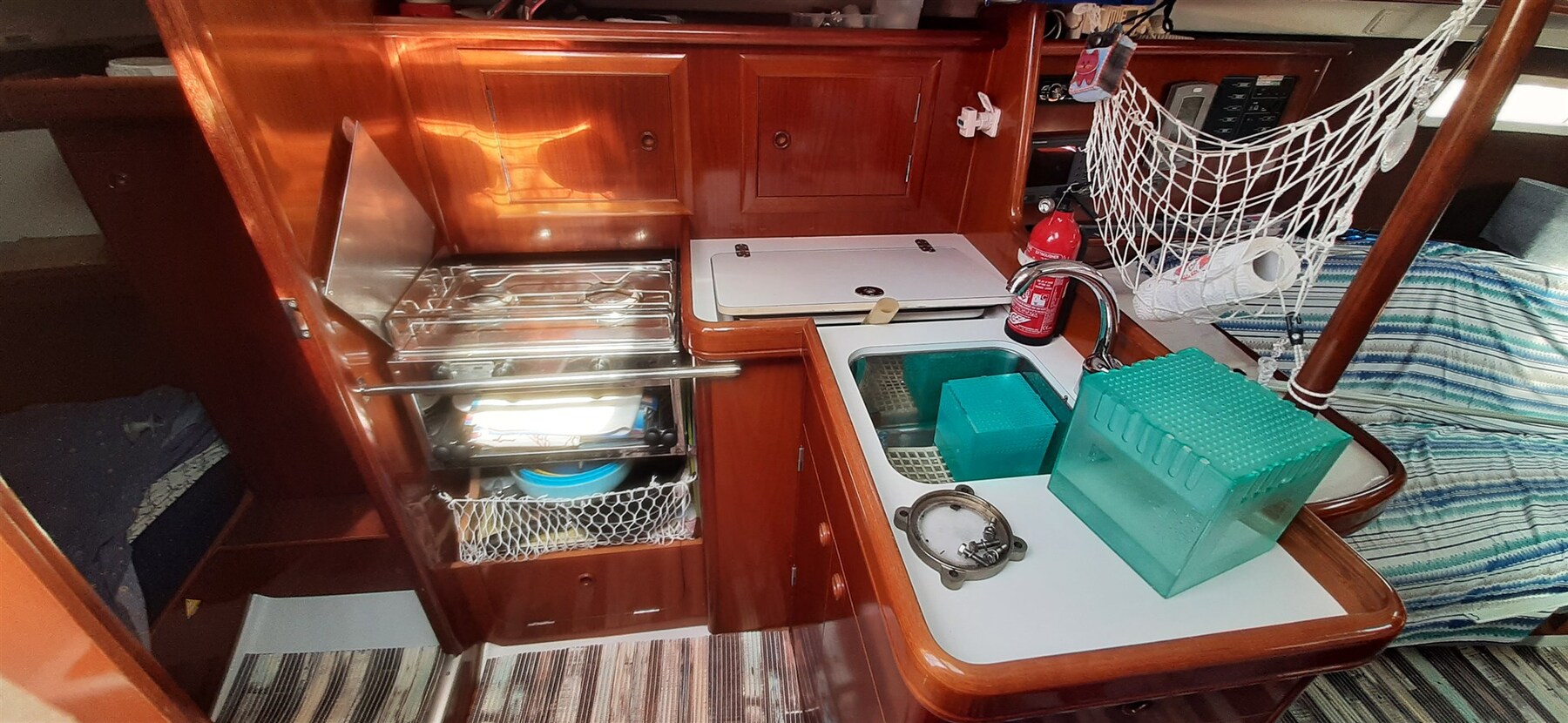 Motoralarm, Anker (ROCNA 10 kg), Druckwasserpumpe, Batterien (2024 160 Ah + 80 Ah), Landstromkabel, Cockpitdusche, Plattform, manuelle Bilgepumpe, Landanschluß, Rectifier, elektrische Ankerwinde (800W), Badeleiter, Windex.