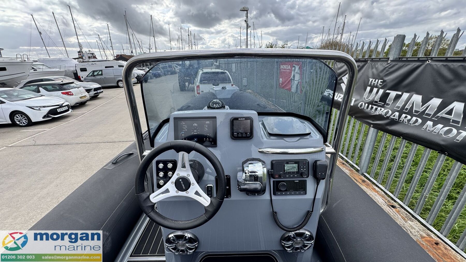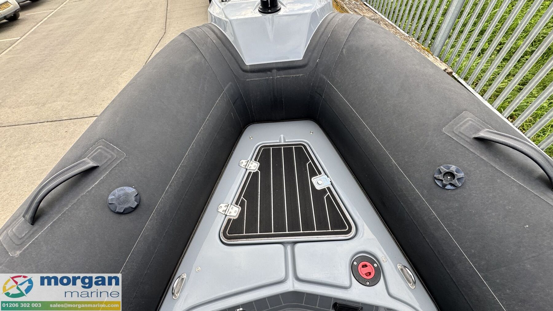 Deck: Deep GRP V-hull with black Hypalon tubes. Rubbing strake. Anti skid decking. Safety handles and carrying handles. Hard tube end with 2x anti skid steps on each. Bow locker. Hull ventilation system. Water ski mast. Twin self bailing unit. Front towing bow ring. Pop up mooring cleats. Built in davit lifting points. Bow roller. Deck shower. Bow step plate. Overall mooring. Swim platform with stainless steel telescopic boarding ladder.