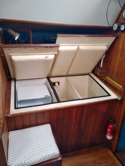 The interior is bright and spacious, featuring an inside wheelhouse offering panoramic visibility and an interior helm mechanically linked to the outside steering. The saloon includes a large convertible table surrounded by generous storage. The galley is equipped with an ENO stove, gas water heater, refrigerator, and three freshwater tanks totalling 320 litres. The aft cabin offers a large double berth and significant storage, while the starboard cabin provides two convertible bunks. Forward, a bathroom with a bath/shower and hot/cold water leads to the forward cabin with a semi-double berth and a very large sail locker.