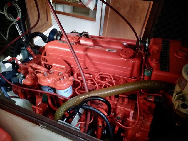 El motor es un Fornaut diésel de 83 CV con unas 3.200 horas, alimentado por un depósito principal de 600 litros integrado en la quilla y un depósito diario de 70 litros. El acceso al motor es excelente desde las cabinas laterales. El circuito de gasoil dispone de pre-filtro y doble filtración, la bomba de agua dulce fue sustituida en 2023 y la hélice tripala Vetus está totalmente protegida por el timón apoyado sobre el codaste.