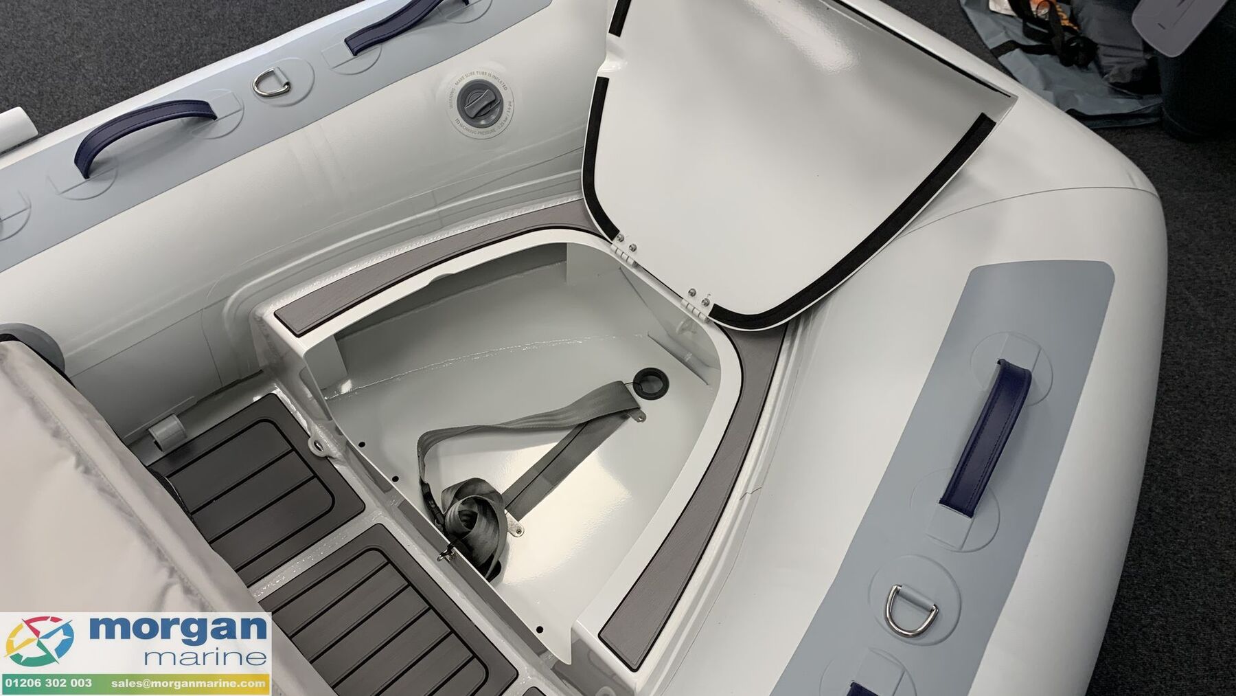 Deck: PVC tubes 44cm diameter. Self-draining deck. Welded seams. Flush mount non return valves. High tensile chromated & powder coated aluminium hull. Bow locker (Fit 24L fuel tank). GRP bow step. Integrated transom supports. Bow cushion. Lifting points and towing eyes. Tow bridle points. Brushed foam teak finish deck. Heavy duty rubbing strake and full length keel guard.