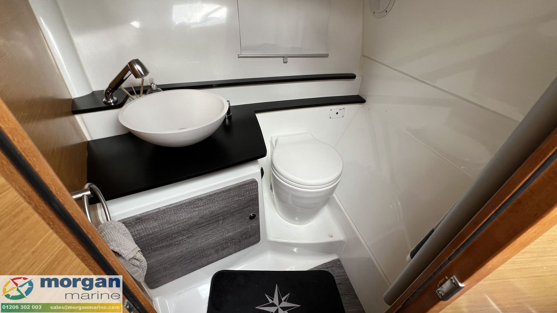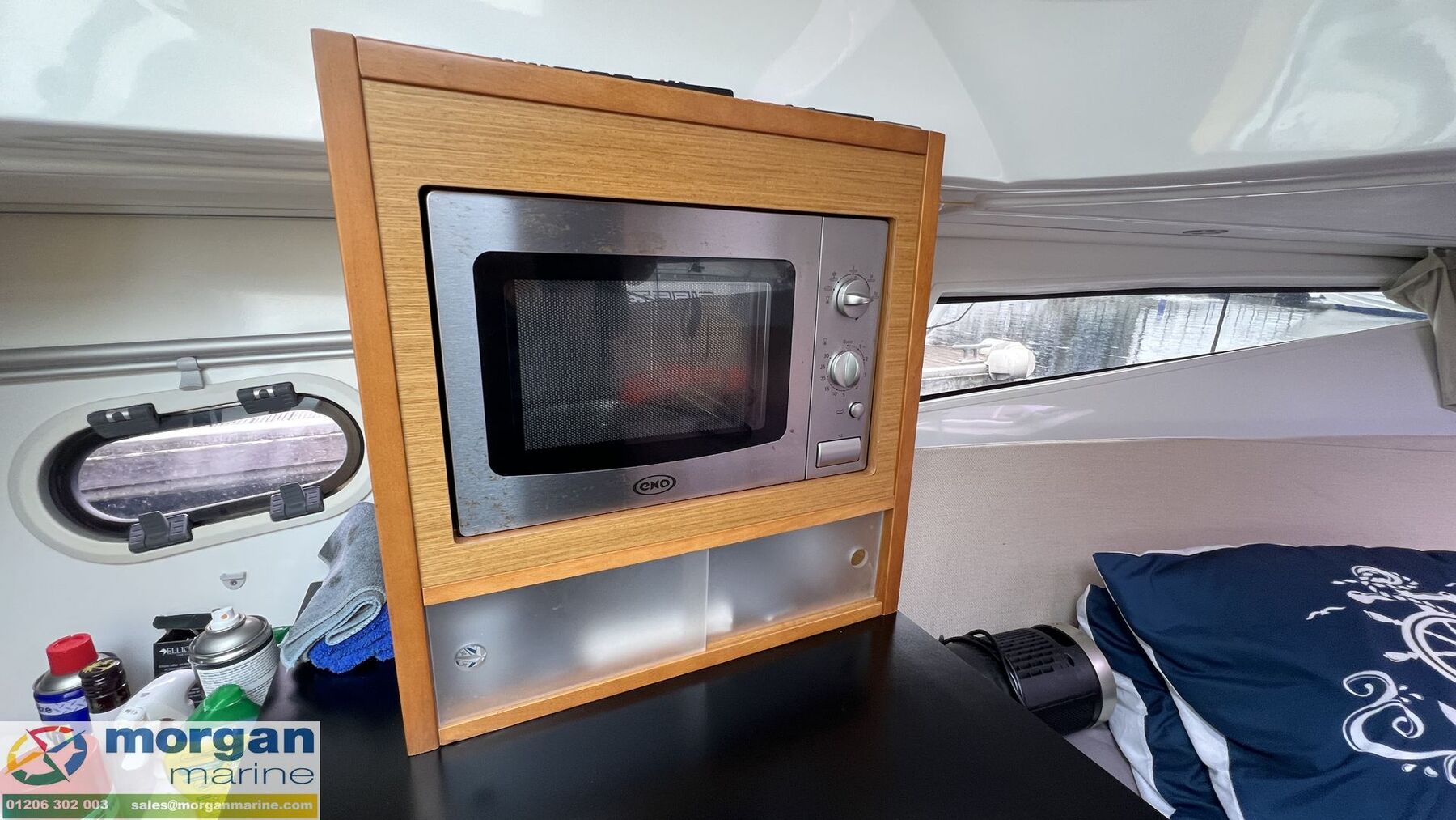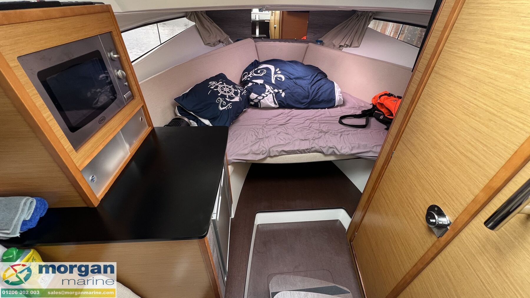 Cabin: Steps down in cabin area. Forward 2-berth cuddy with cushions + double berth complement. 24 Inch smart TV in cabin (2025).Overhead lights. Transparent black plexi sliding door down from external cockpit. Opening portholes to heads and cabin, opening roof hatch and ventilation window to cabin ceiling. Front sundeck mattress - 2025. Separate heads compartment with shower, electric flush toilet with Jabsco water pump (2025) and heated towel radiator on timer (2025). Hot water element (2025). Interior galley with fridge and microwave. Black out blinds in cabin (2025).