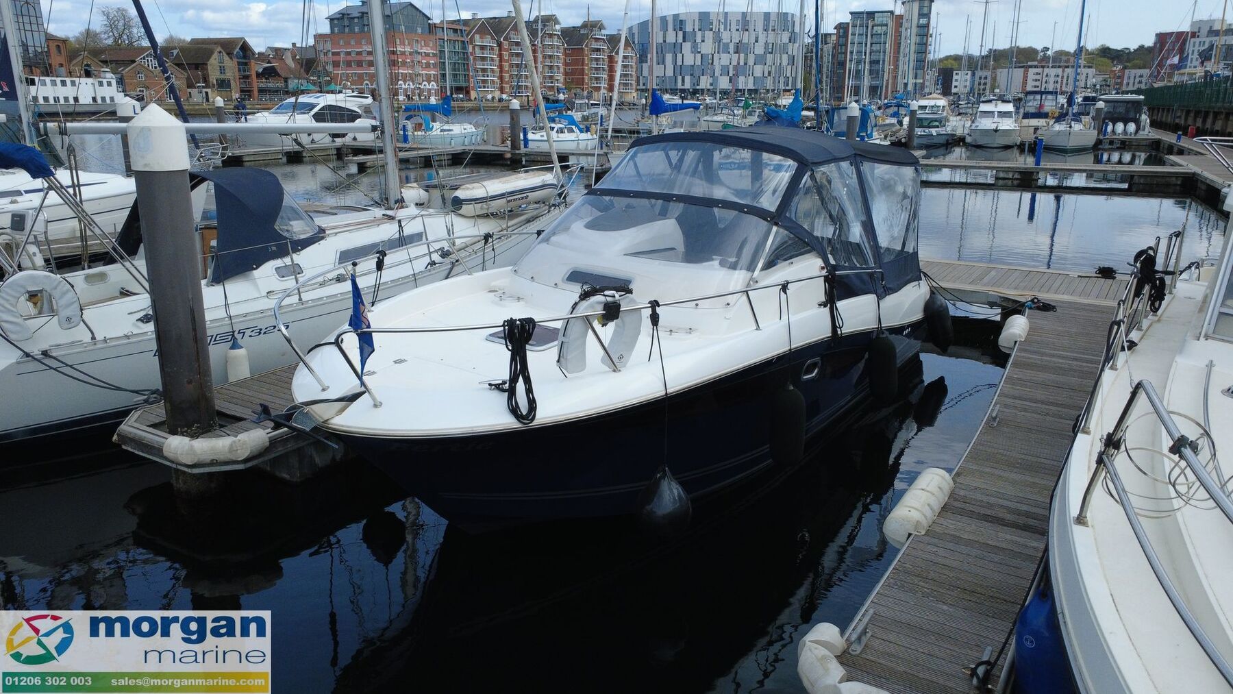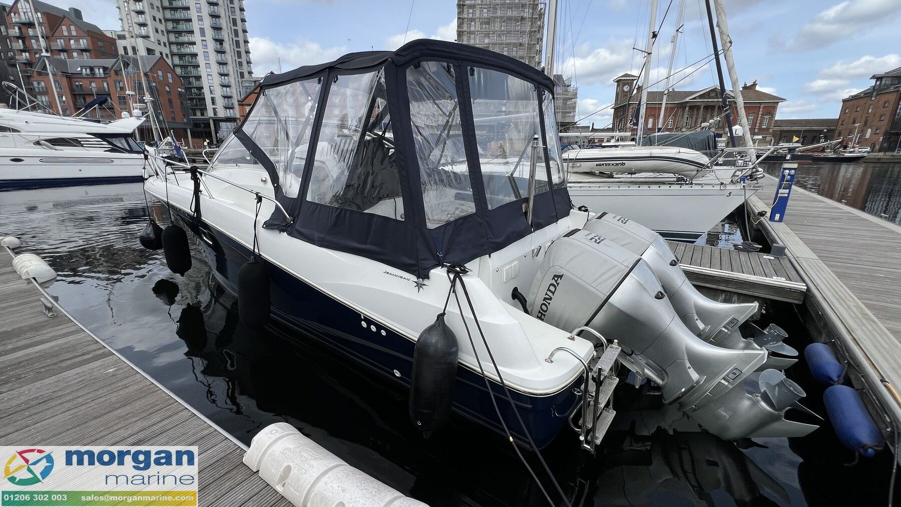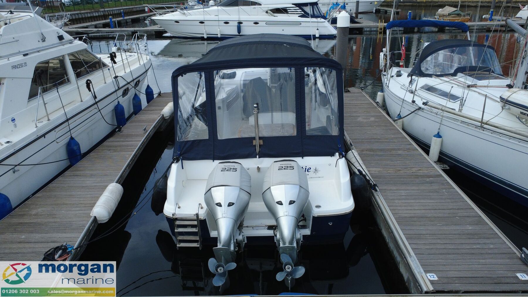 We are delighted to present this superb 2013 Jeanneau Cap Camarat 8.5 WA “Bertie”, newly arrived at Morgan Marine and benefitting from a comprehensive overhaul in 2025, making her a fantastic turnkey opportunity for the season ahead. This stylish and versatile walkaround cruiser has been exceptionally well maintained and thoughtfully upgraded, combining performance, comfort, and practicality. In 2025, “Bertie” underwent significant works including a full hull cut and polish, fresh antifouling, and a complete engine service. She also features a newly upholstered front sundeck mattress cushions, enhancing relaxation space on board. The enclosed canopy, with removable sides and roof sections, offers excellent flexibility whether you want full protection or open-air boating. The onboard electronics have been upgraded to a high standard, including a Garmin 1223 XSV chartplotter, Garmin VHF radio, and Garmin fish finder with depth gauge, all new in 2025. Entertainment is provided by a Fusion audio system with DAB and four speakers, complemented by upgraded LED lighting throughout the boat. Additional onboard convenience comes from 240V sockets with USB and USB-C charging ports. Below deck, the boat offers a comfortable forward 2-berth cuddy cabin with cushions and a double berth conversion, ideal for overnight stays. There is also a separate heads compartment fitted with an electric flush toilet and shower, providing excellent practicality for extended trips. Powered by twin Honda BF225 outboards, “Bertie” delivers strong, reliable performance, while the bow thruster ensures easy handling and manoeuvrability in marinas and tight spaces. Having had just two owners from new, and originally supplied by Morgan Marine, this boat presents in excellent condition and is ready for immediate enjoyment. This is a rare opportunity to acquire a well-specified and recently upgraded Cap Camarat 8.5 WA. Contact Morgan Marine today to arrange a viewing or to find out more.