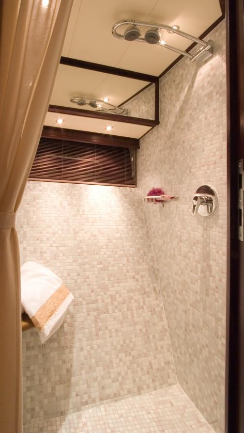 She sleeps 6 in two double staterooms, both with ensuite central heated bathrooms with shower, wash basins and toilets. Her third guestroom on starboard side is also equipped with an en-suite bathroom.