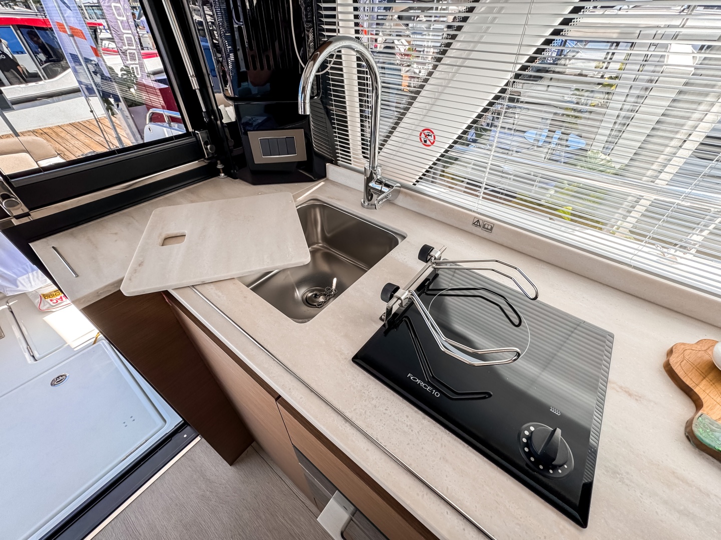• Electric furling aft cockpit sun protection (2 carbon poles / sunworker charcoal / extra vertical sun protection aft)