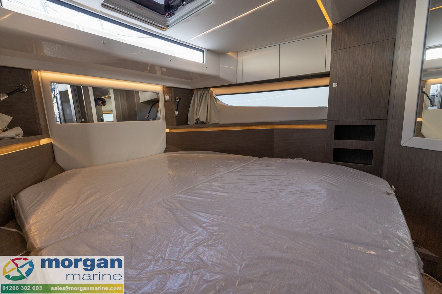 Cabin: Forward cabin with double berth + headband cushion, roof hatch, opening porthole, hull + deck windows, LED lights + reading lamps, wardrobe, shelves and lockers. 2nd cabin (port side) with 2x single berths, opening porthole, wardrobe and LED lights + reading lamps. 3rd cabin with 2x single berths, opening porthole, wardrobe, LED lights + reading lamps. Two toilet compartments - both with electric flush toilet, separate shower, washbasin and opening porthole. Removable carpets in cabins and saloon. Prefit for TV in front cabin and saloon.