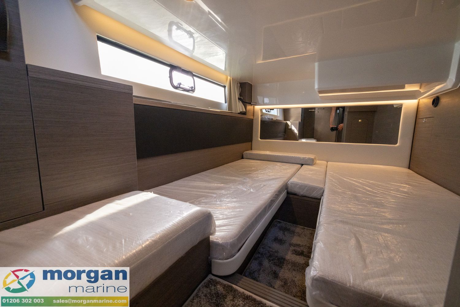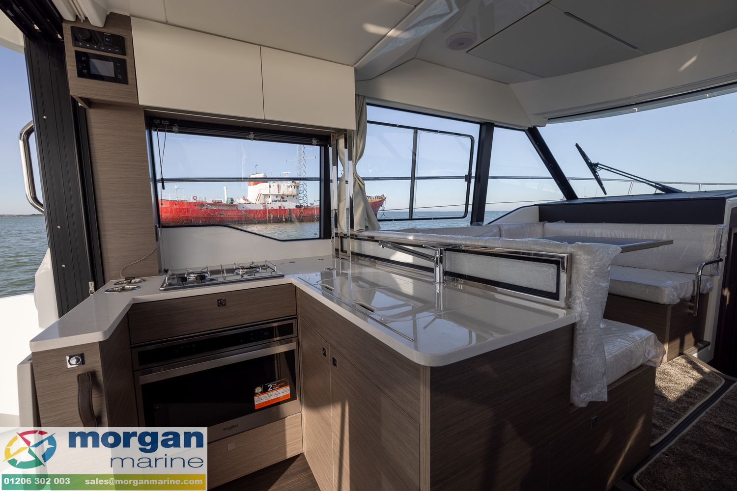 Cockpit: Wheelhouse with aft sliding door, starboard side sliding door, port side sliding window, front glass windscreen with port and starboard windscreen wipers + screen wash. Adjustable pilot bolster bench seat. Fabric upholstery in saloon. Wheelhouse saloon on port side with U-shape seating (with lockers under) around table. Aft galley with sink (electric pressurised hot water), 144L fridge, electric stove + oven, bar, storage and overhead lockers. Wheelhouse curtains. Flybridge with second helm position (with full engine controls) + windscreen + large bolster pilot seat + co-pilot bench, stainless steel pulpit, table and aft sundeck cushions + fridge.