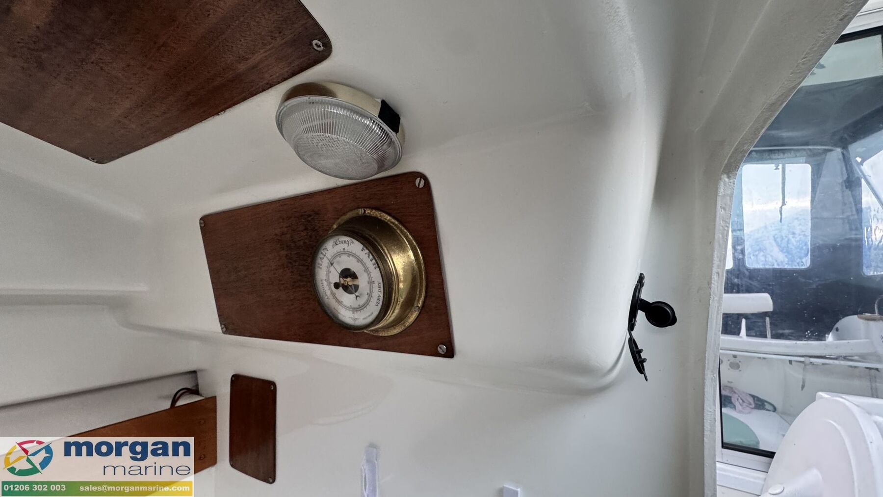Cockpit: Large wheelhouse with pilot seat with dash and engine controls. Sliding aft door to wheelhouse. Roof hatch. Large windscreen with good visibility with 2x electric windscreen wipers. Port side galley with stove and storage. Starboard side sink. Lazarette deck locker. Large cockpit bench style fold up seating with removable cushion.