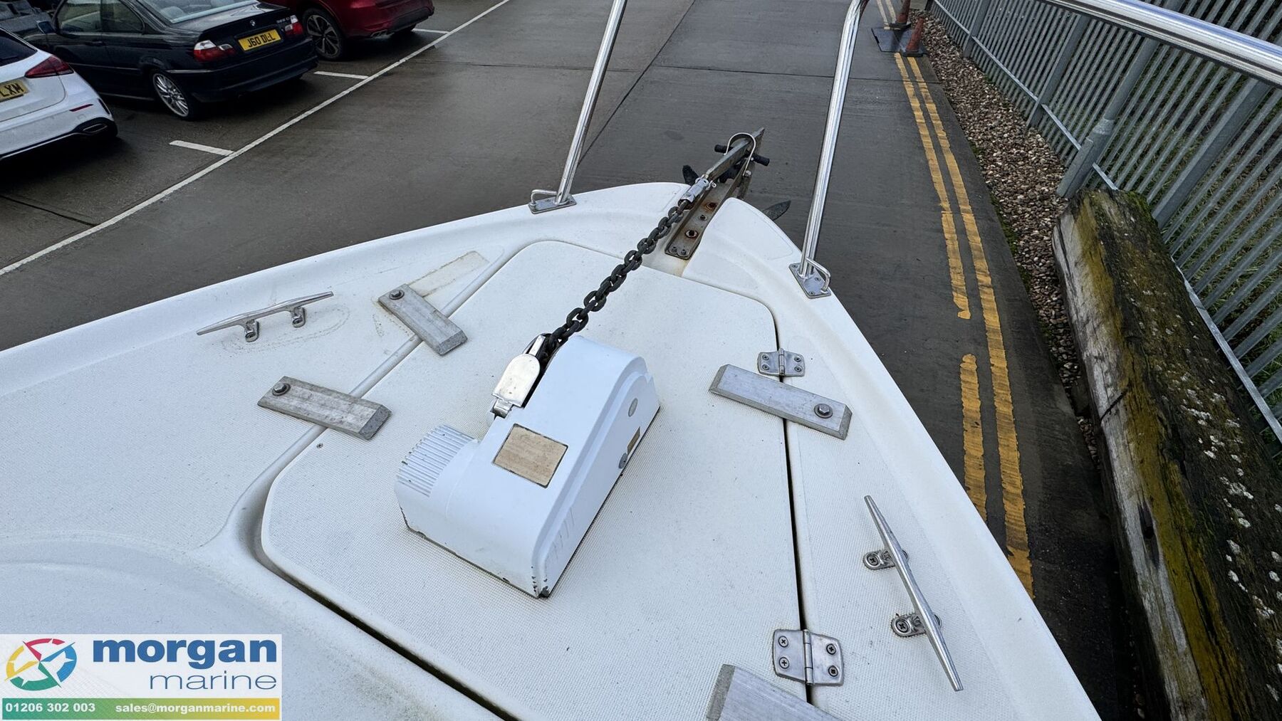 Deck: GRP hull. Full enclosed blue canopy. Electric windlass with anchor, chain and rope. Anchor locker. Fishing rod holders. Auxiliary outboard bracket. Fenders. Open front pulpit and hand rails. Folding boarding ladder. Deck hatch. Mooring cleats.