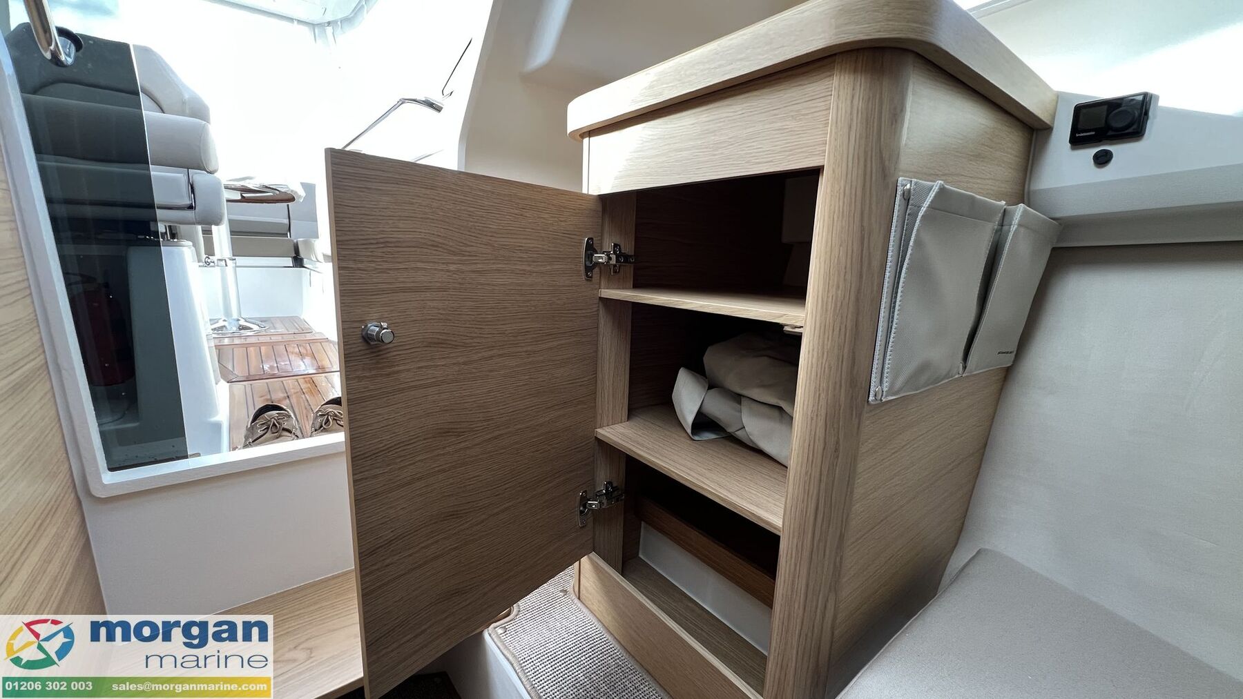 Cockpit: The spacious cockpit blends panoramic visibility with premium comfort. Laminated safety glass and a wide arched windscreen - complete with protection and defroster - ensure excellent sightlines from the helm. Starboard side ergonomic helm and co-pilot seats with bolster, designed for both seated and standing positions. Port side galley, which includes a sink with hot water, fridge and storage + Nimbus crockery & cutlery. Large skylight with blinds in T-top roof.