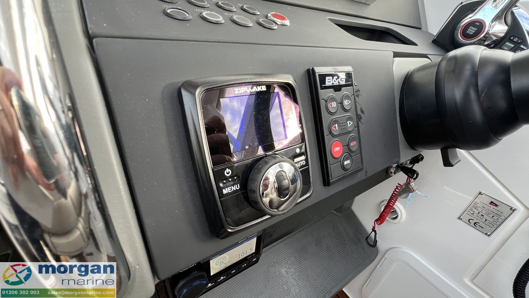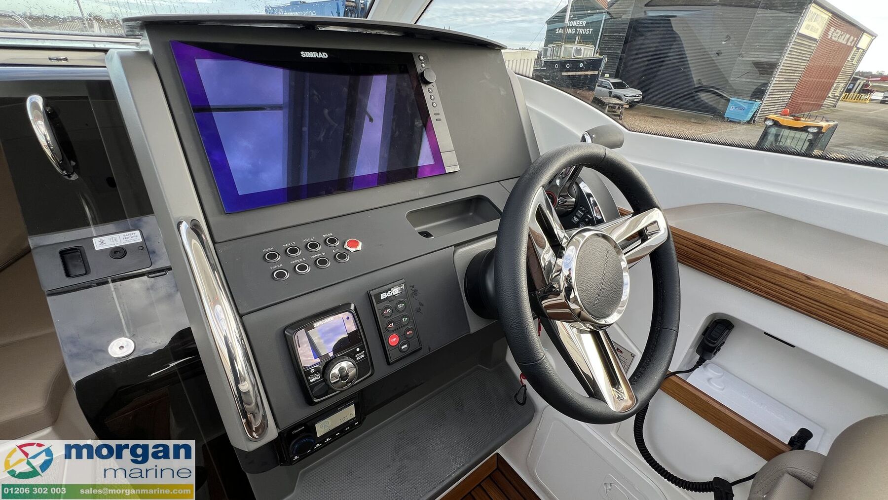 Electronics: Electrical canvas roof system including enclosed canopy on aft cockpit. 2x blue underwater lights. Remote control for bow thruster and stern windlass. Isotherm 15l hot water system 230v. Chargemaster shore power 12/25a, 25m cable, 2x 230v outlets. Wireless charging nest for phone. Hifi Package - Clarion CMM30 stereo, 2x CMS651 speakers in cockpit. Simrad NSS EVO 3S 16" plotter. Simrad xSonic SS60 sonar - thru-hull transducer. Simrad autopilot + OP12 controller. Simrad HALO20+ radar. Simrad RS40 VHF + AIS receiver and antenna. Search light on T-top. Nimbus Connect boat monitoring.