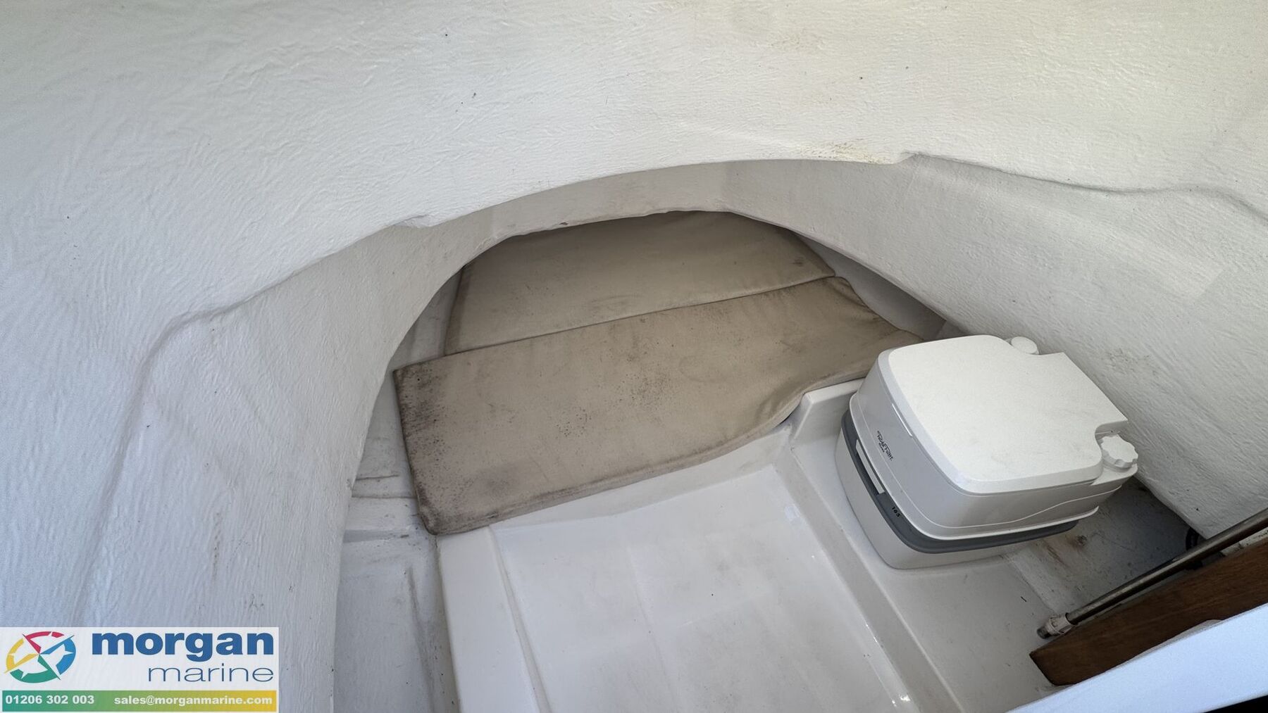 Cabin: 2 berth cuddy area with infill cushion. Chemical toilet.