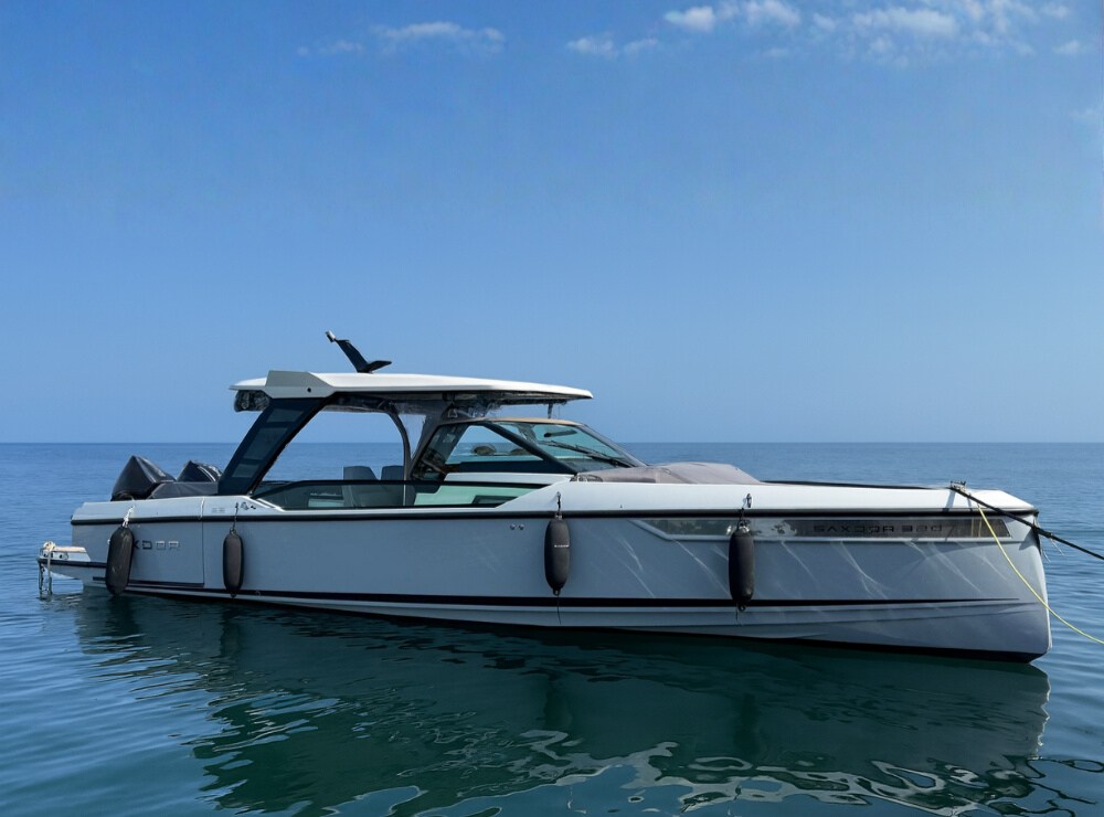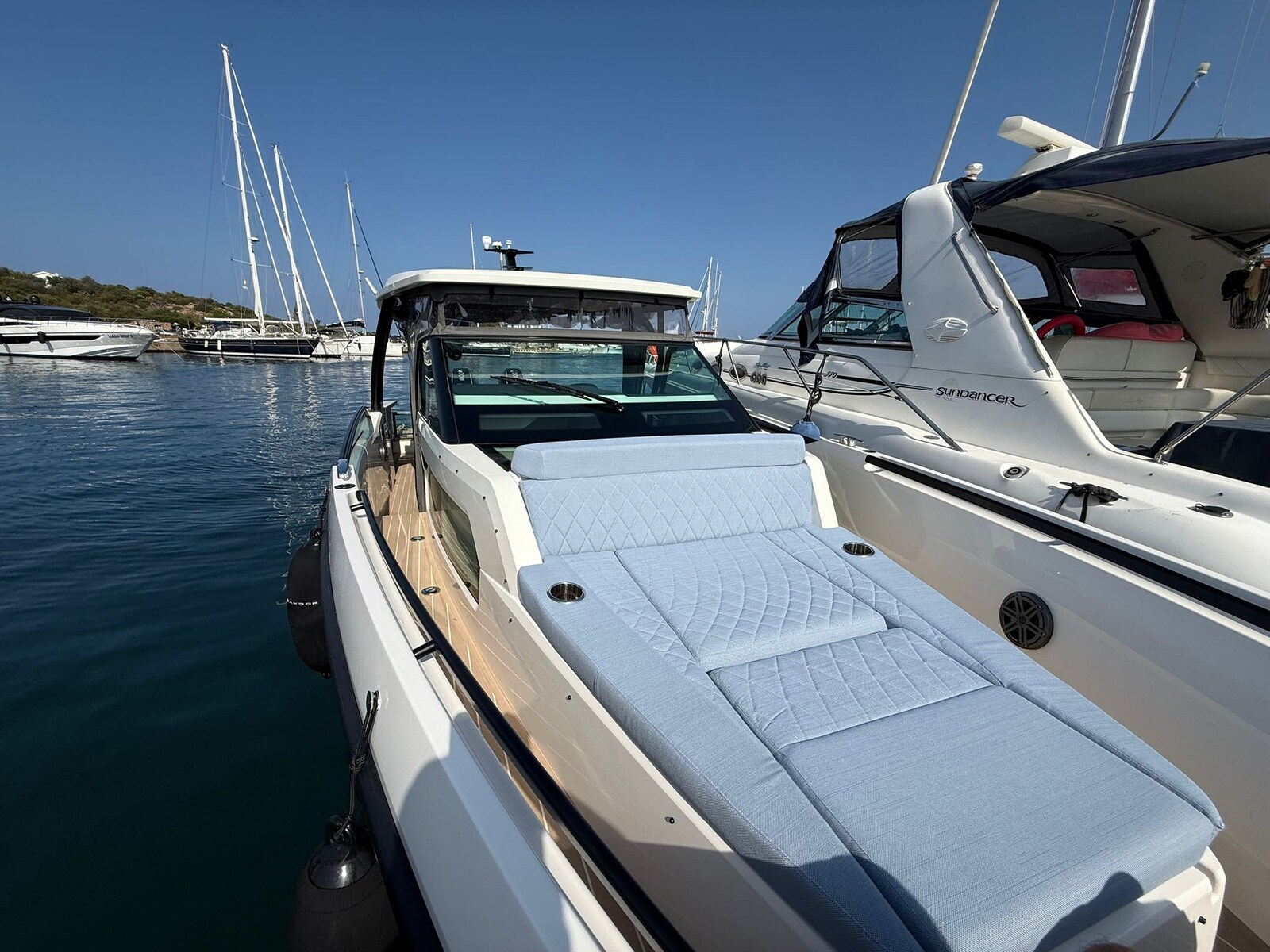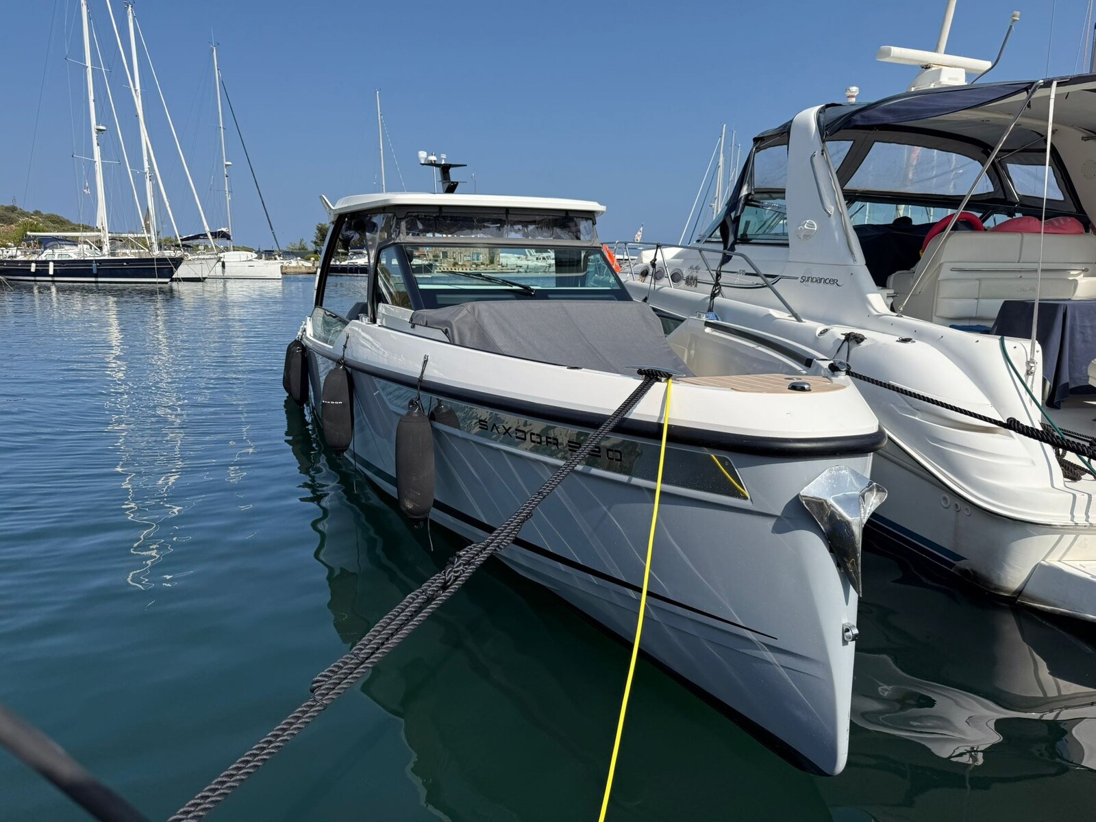 This Saxdor 320 GTO model 2025 is in impeccable condition, with very few hours of use. The gray hull combined with the Florida blue upholstery creates an elegant and modern contrast, further enhanced by the synthetic teak flooring. The folding bulwarks and the dinette that can be transformed into a large sundeck make this sporty walkaround extremely versatile: perfect for fast cruising at 30 knots as well as for relaxing stops at anchor. Below deck, a forward double cabin with separate electric toilet ensures comfort and privacy. Completing the equipment is a premium audio system from bow to stern with subwoofer and an induction plate on deck. Immediately available, a must see.