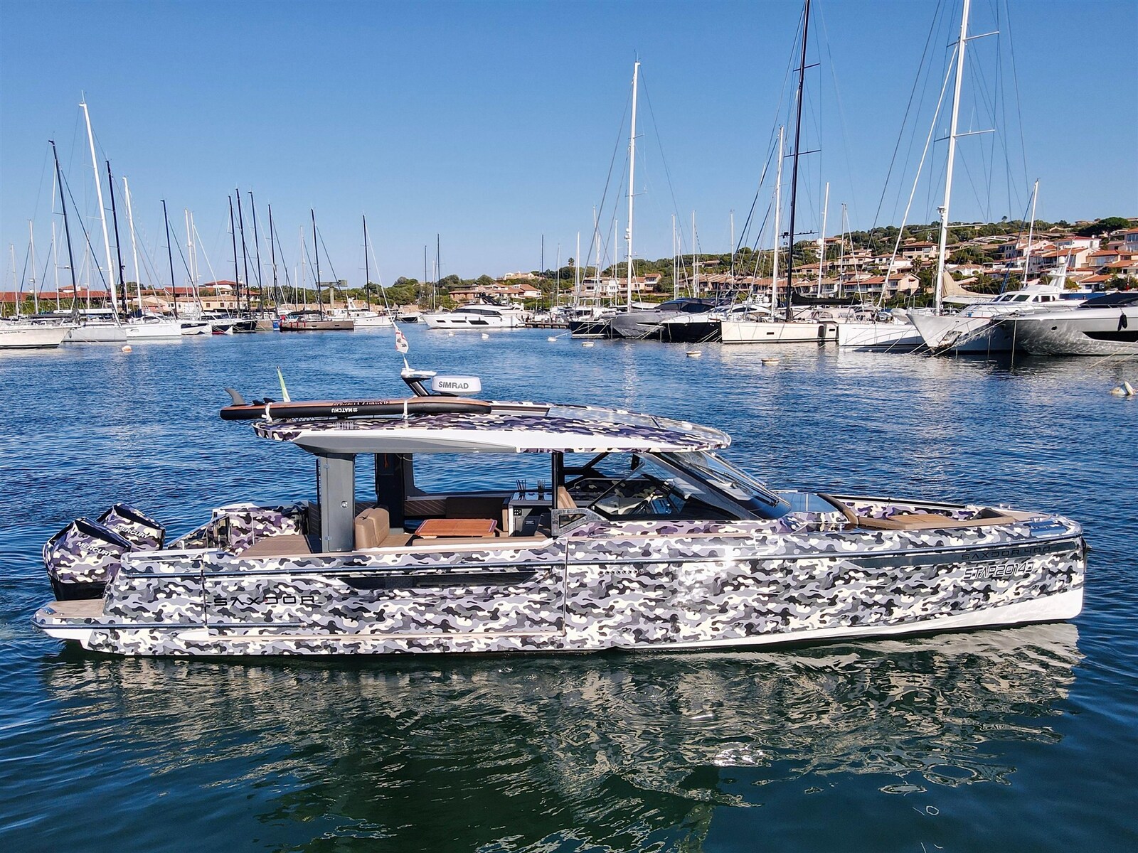 This Saxdor 400 GTO practically full specs, delivered to its first and only owner in the summer of 2025, best embodies all the characteristics that have made Saxdor a state-of-the-art shipyard. The folding bulwarks, almost four meters long, surprisingly expand the livability of the large aft living island, which can be easily transformed according to needs. Comfort, practicality and style are the key words of this unit, equipped with generator replacement, air conditioning, external BBQ, induction hob and double 51-litre external refrigerator. Weekends at sea become an uncompromising experience, completed by the stern and bow awnings and the power of the two 400 hp Mercurys, capable of pushing this queen of the sea up to 45 knots. Gelcoat in perfect condition, protected by camouflage wrap.