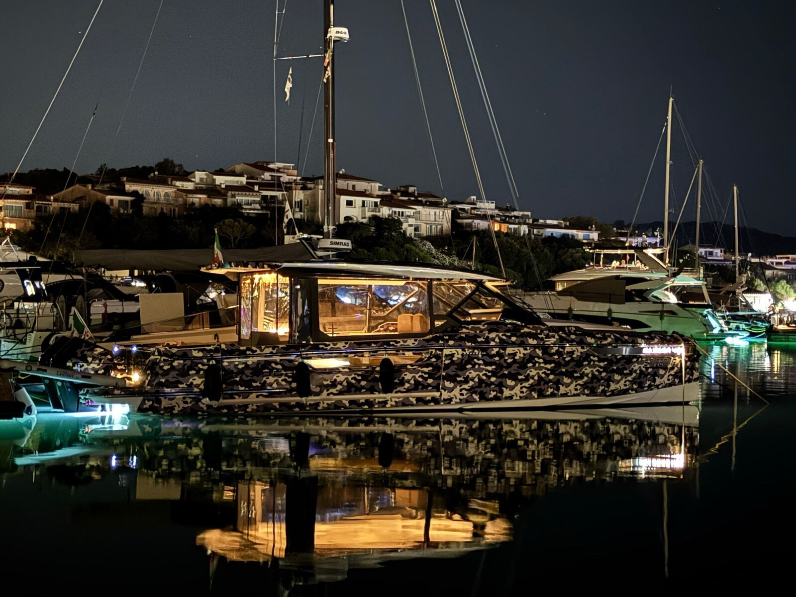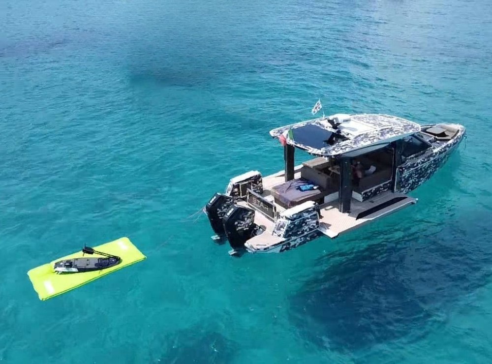 2 Аварийный сигнал двигателя, Аварийный сигнал трюма, Альтернатор, Якорь (Ultra SS), Откачка грязной воды с палубы, Auto Dynamic Trim Interceptor, Автоклав, Автоматический дифферент, 4 аккумуляторы (Motori, servizi, elica di prua, + batterie al Litio), 4 Складные бутсы, Зарядное устройство (Mastervolt Chargemaster), Кабель берегового питания, Особая окраска (Wrap Camouflage), Леера, внешняя душа, Винт носовой части - bowtruster (Sleipner), Электрические клапаны (Zipwake interceptor system), Hard top (apribile), Индикаторы закрылка, Умывальник в кокпите, любезность фонари, подводный свет, Мониторинг аккумулятора, 6 Отбойники, Платформа, Насос слива сточных вод из бака, 3 Автоматический трюмный насос, Тиковая палуба (Sintetico), Входная дверь, Боковая дверь, Колодец из тика (Sintetico), Прямая розетка от причала, Прямая розетка от причала, Электрическая якорная лебедка (Con sistema di catapulta dell'ancora), 2 Трап ванной, cockpit table (pozzetto anteriore), Складной стол для гостиной (pozzetto posteriore), guard rails with gates, Рупор.