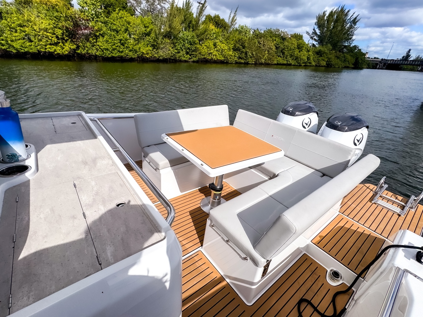 The convertible U-shaped lounge with sunbed transforms the deck into a vibrant social zone—perfect for open-air dining, entertaining, and romantic sunsets. Passenger seats with a leaning function ensure safe, enjoyable cruising. Bow and cabin storage keep everything neatly organized.